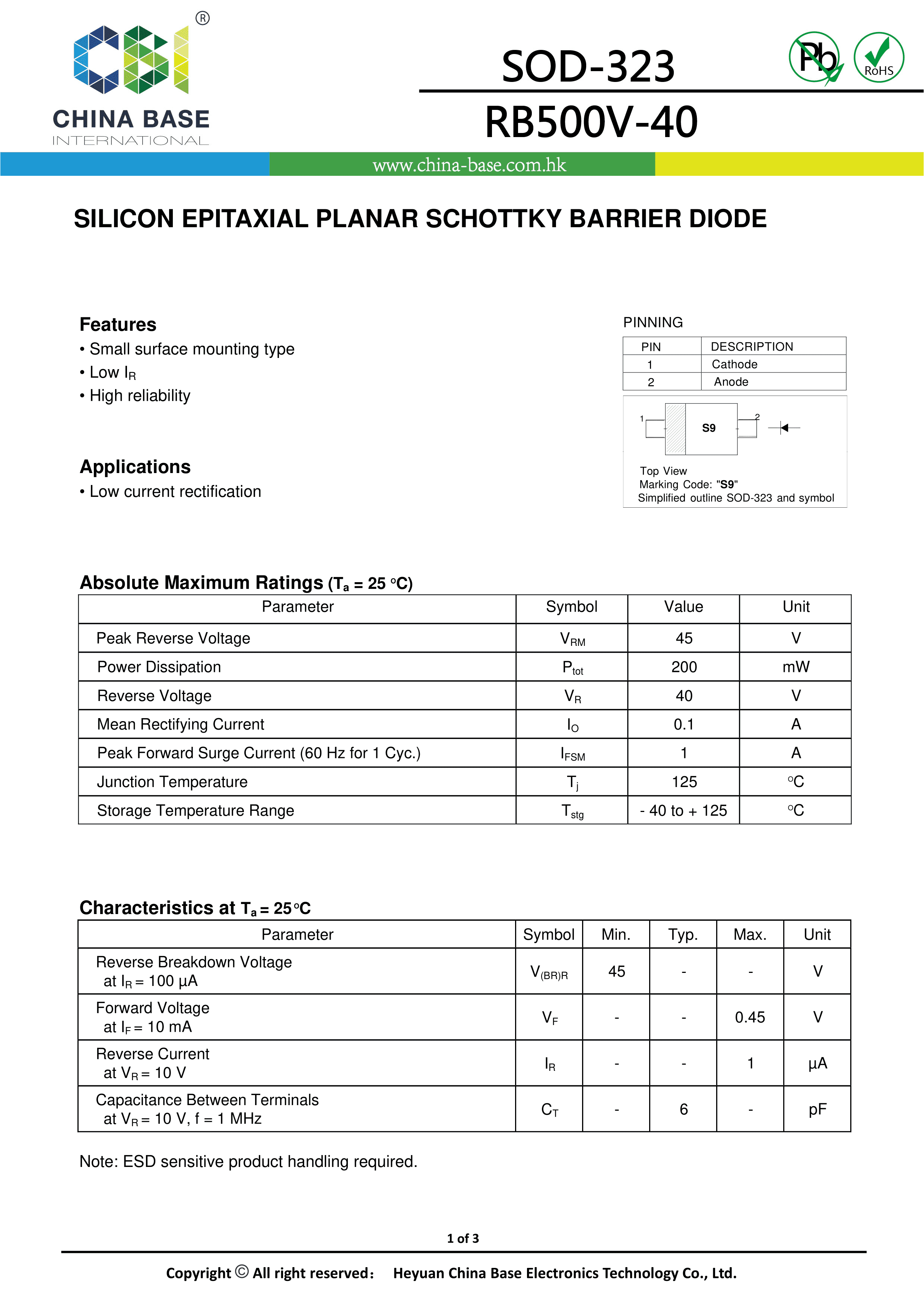 RB500V-40 S9数据手册SOD-323封装CBI(创基)PDF规格书,中英文下载