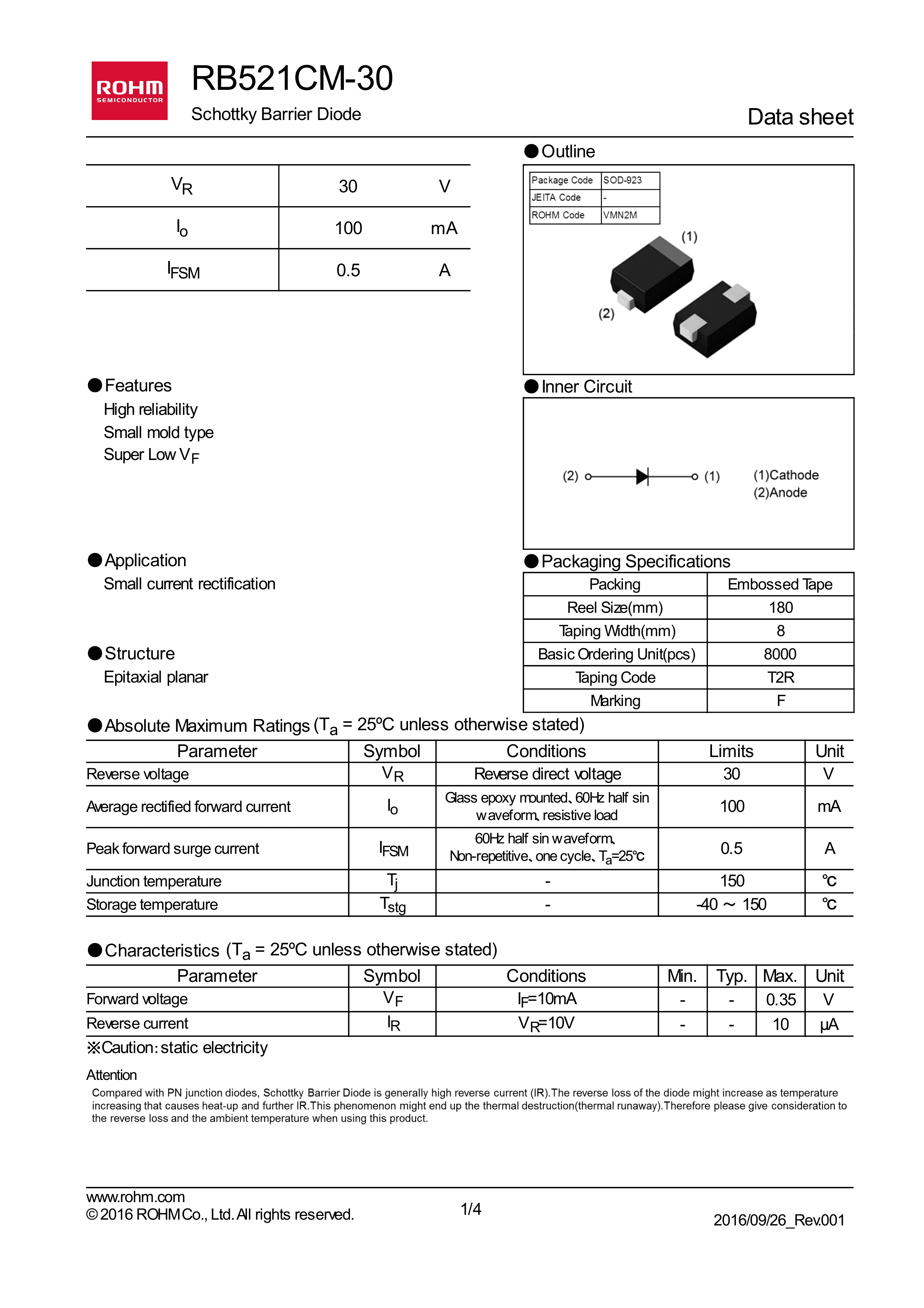 RB521CM-30T2R数据手册SOD-923封装ROHM(罗姆)PDF规格书,中英文下载
