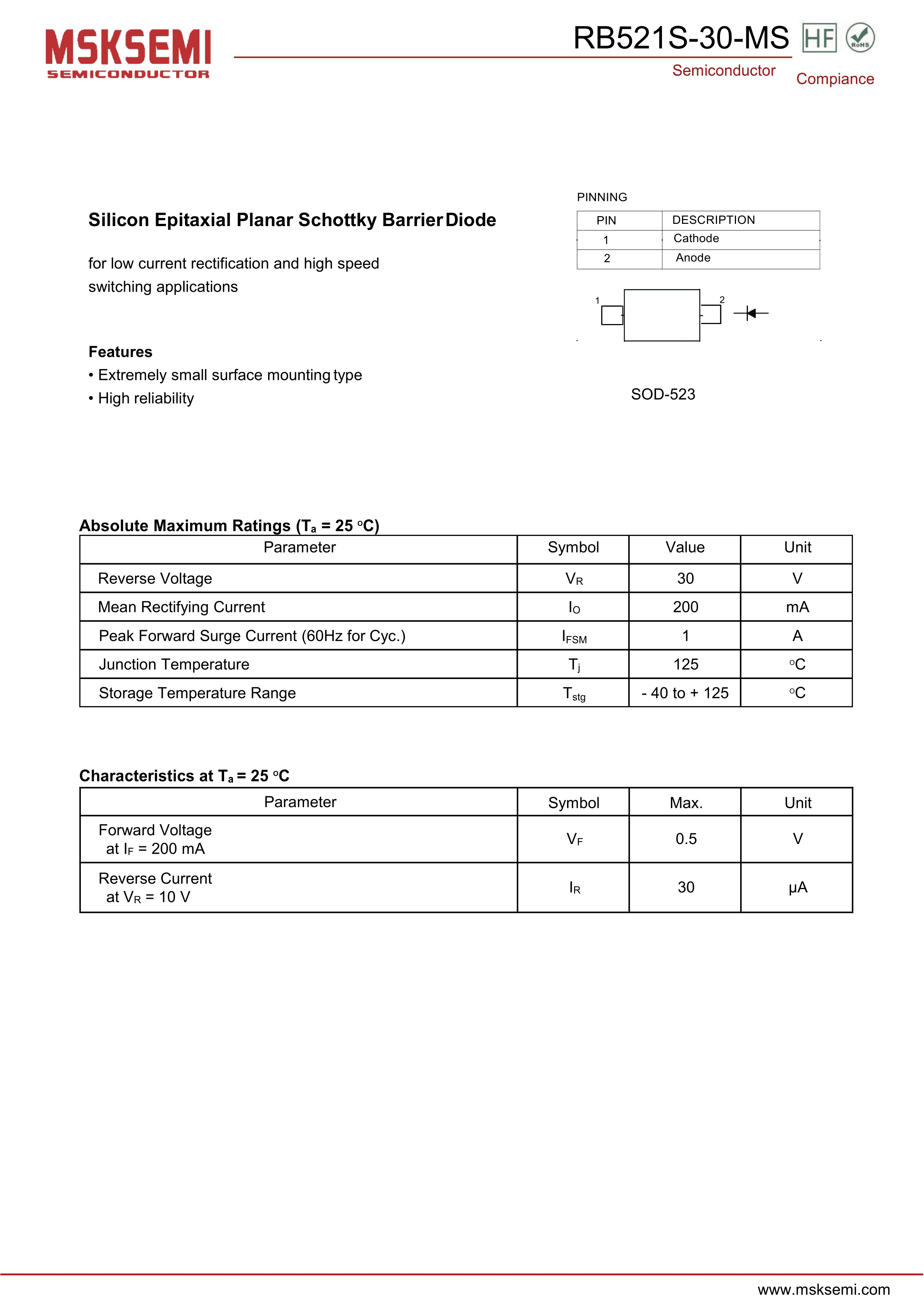 RB521S-30-MS数据手册SOD-523封装MSKSEMI(美森科)PDF规格书,中英文下载