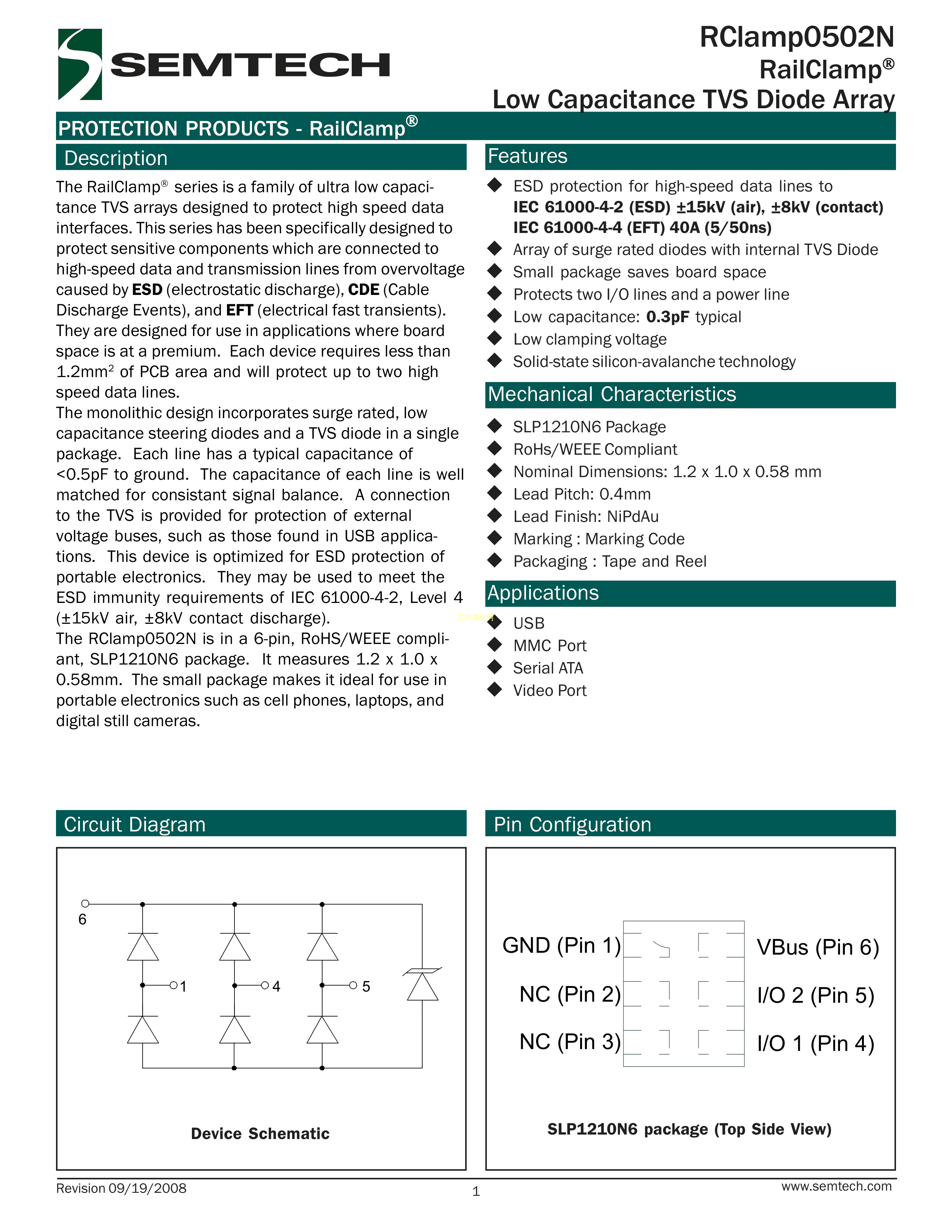 RCLAMP0502N.TCT数据手册SLP1210N6封装SEMTECHPDF规格书,中英文下载