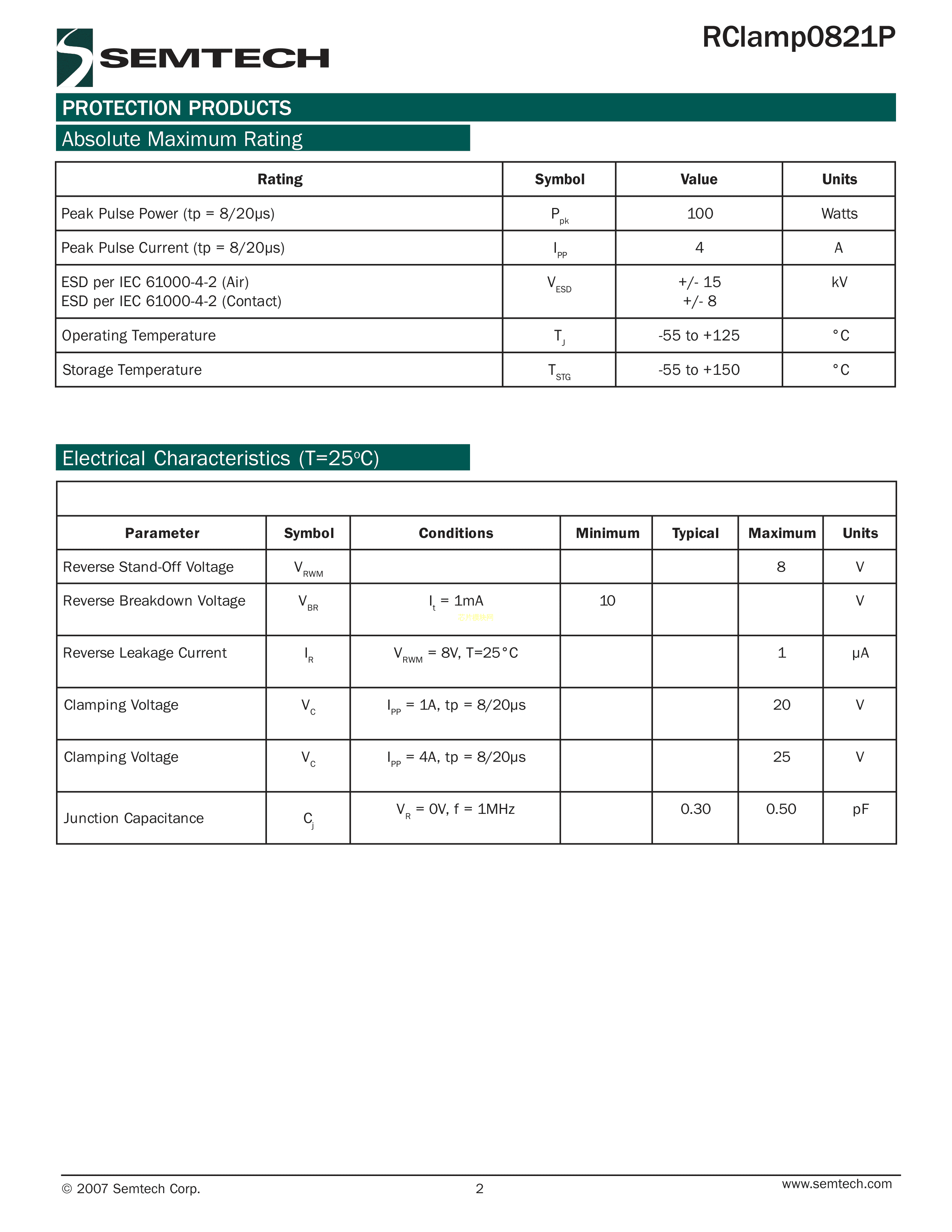 RCLAMP0821P.TCT数据手册SLP1006P2封装SEMTECHPDF规格书,中英文下载