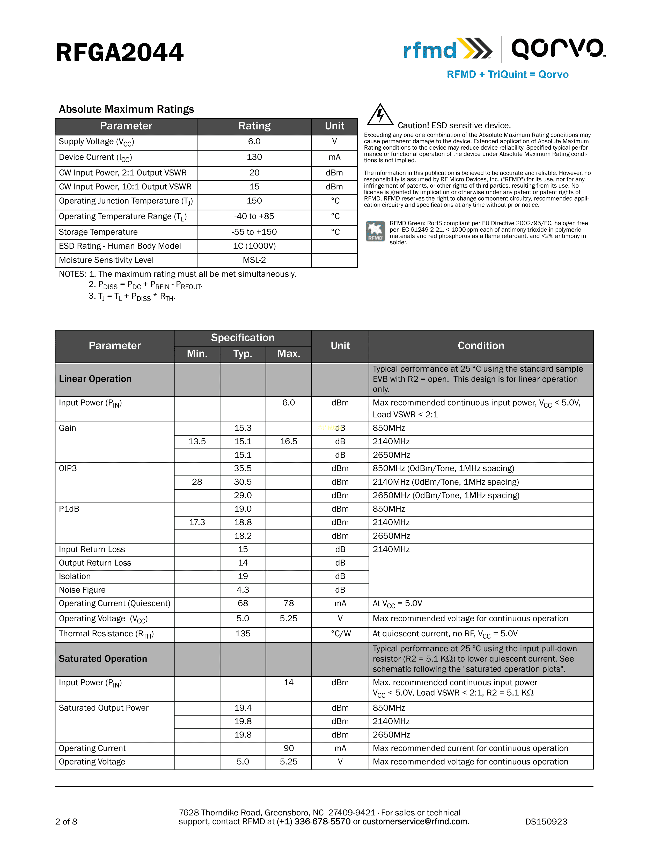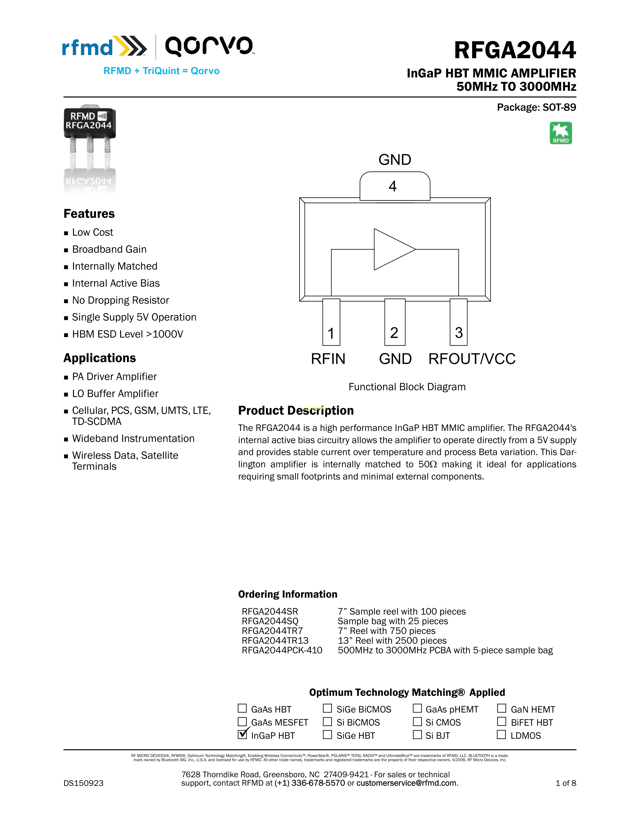RFGA2044TR13数据手册SOT-89-3封装QorvoPDF规格书,中英文下载