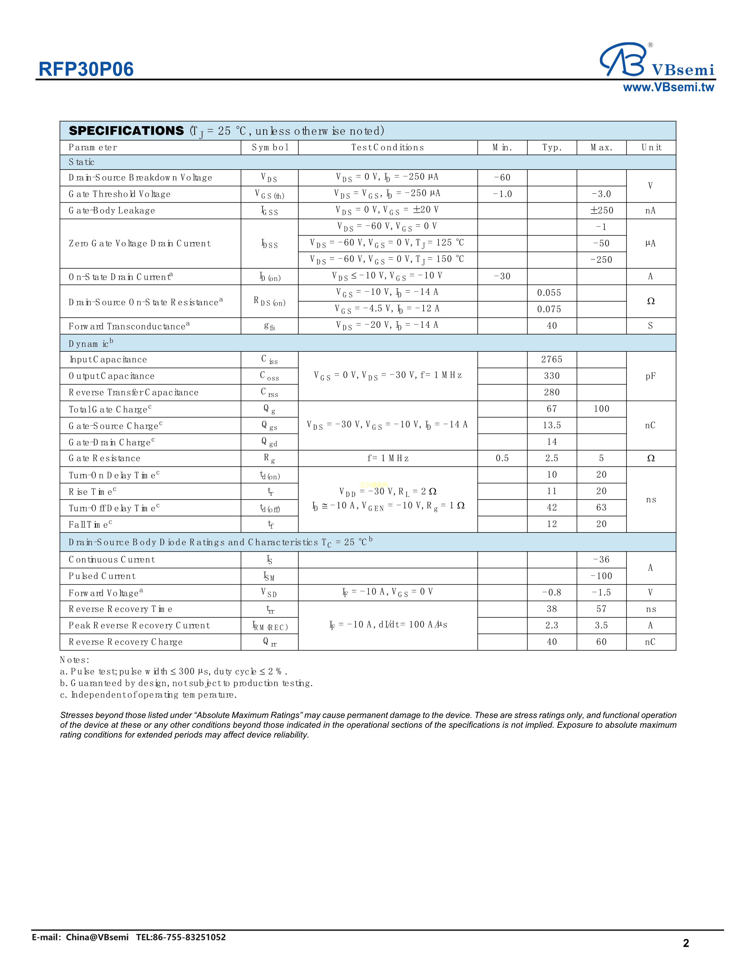 RFP30P06数据手册TO-220AB封装VBsemi(台湾微碧)PDF规格书,中英文下载