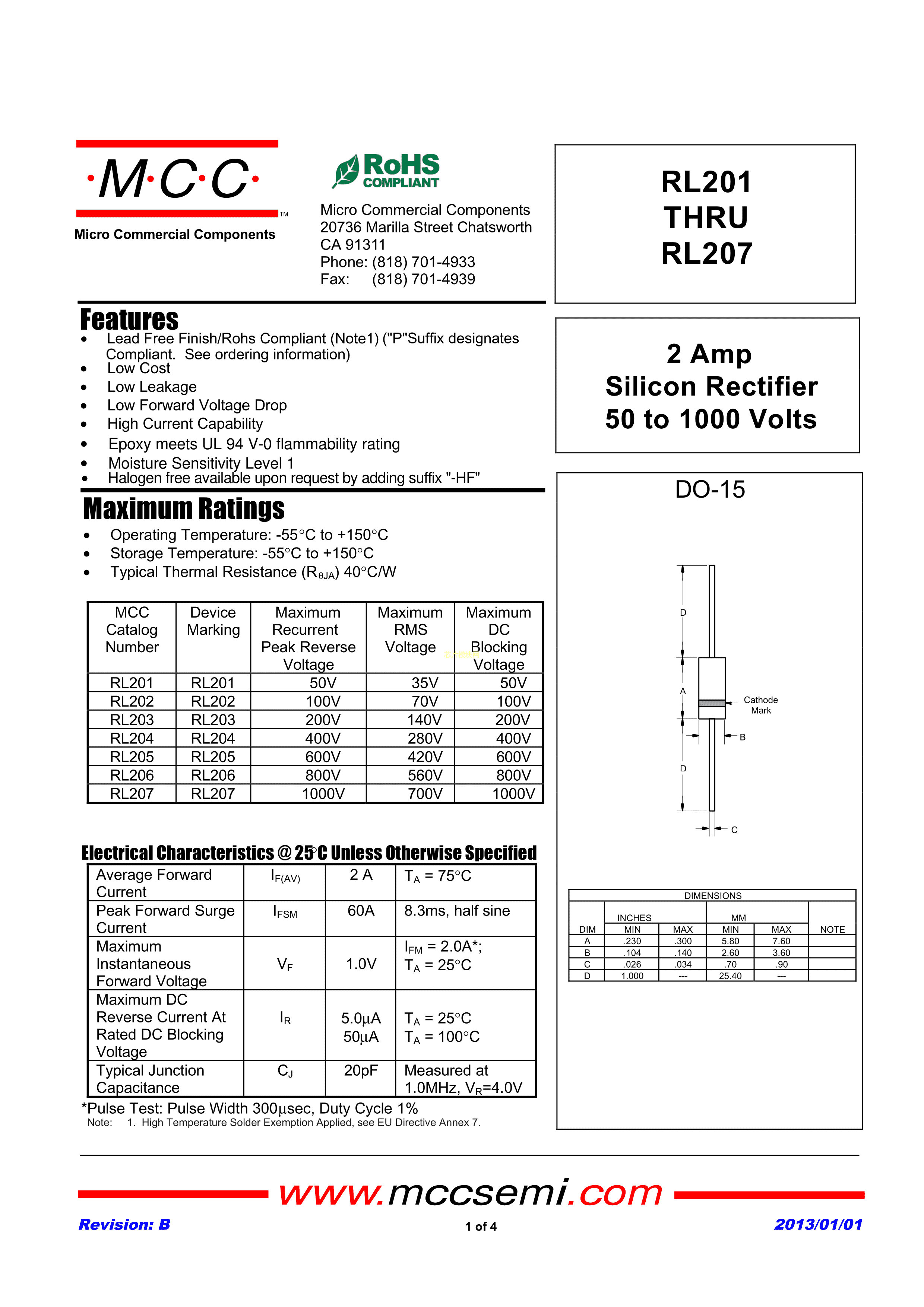 RL205-TP数据手册DO-15封装MCC(美微科)PDF规格书,中英文下载