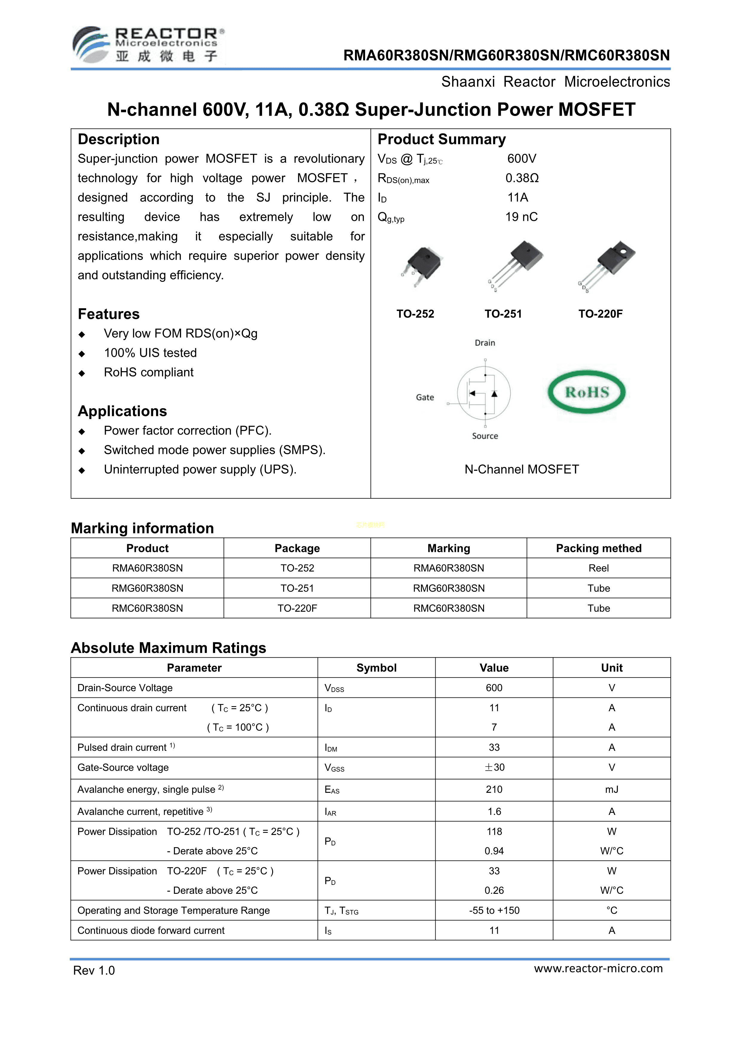 RMC60R380SN数据手册TO-220F封装Reactor-Micro(亚成微)PDF规格书,中