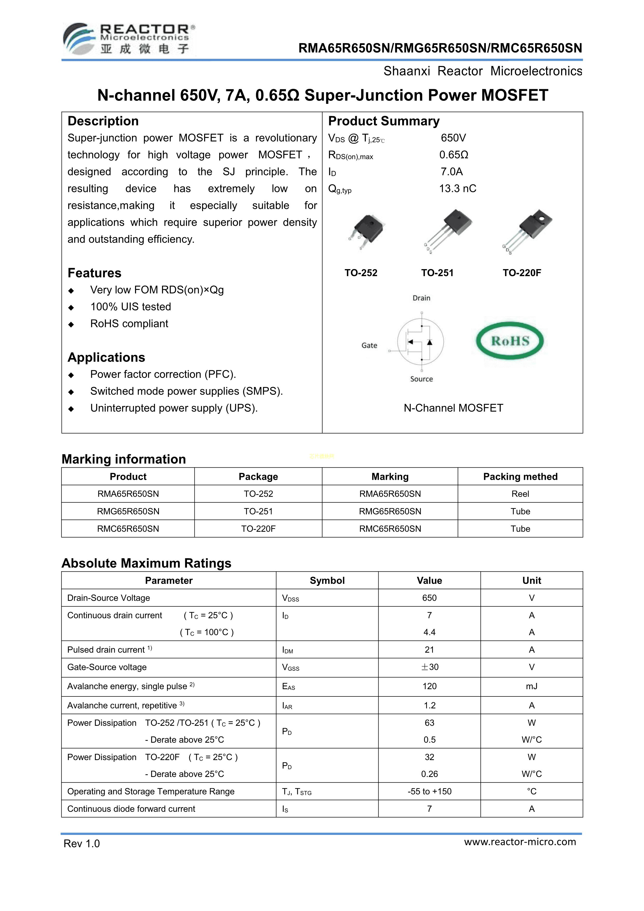 RMC65R650SN数据手册TO-220F封装Reactor-Micro(亚成微)PDF规格书,中