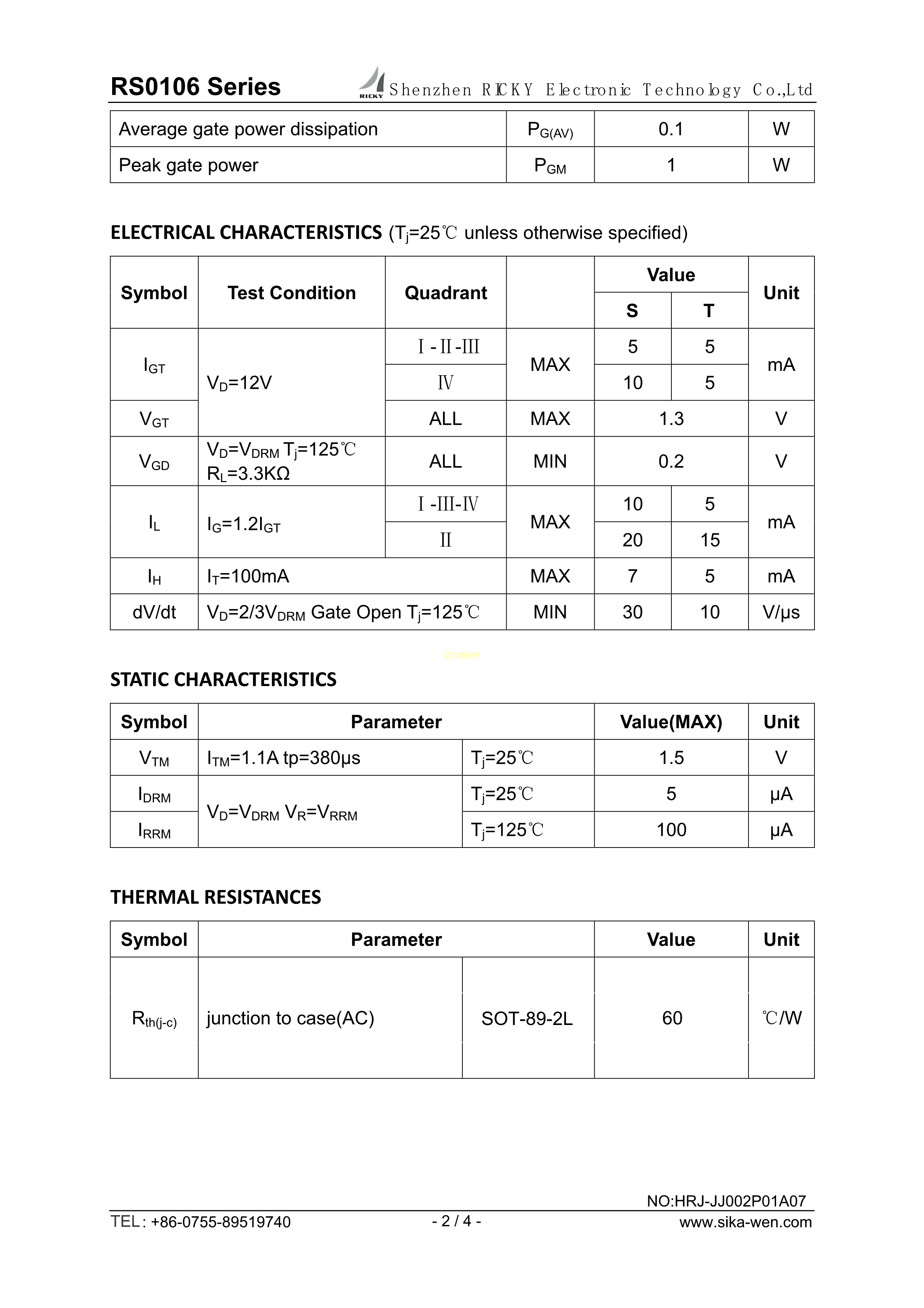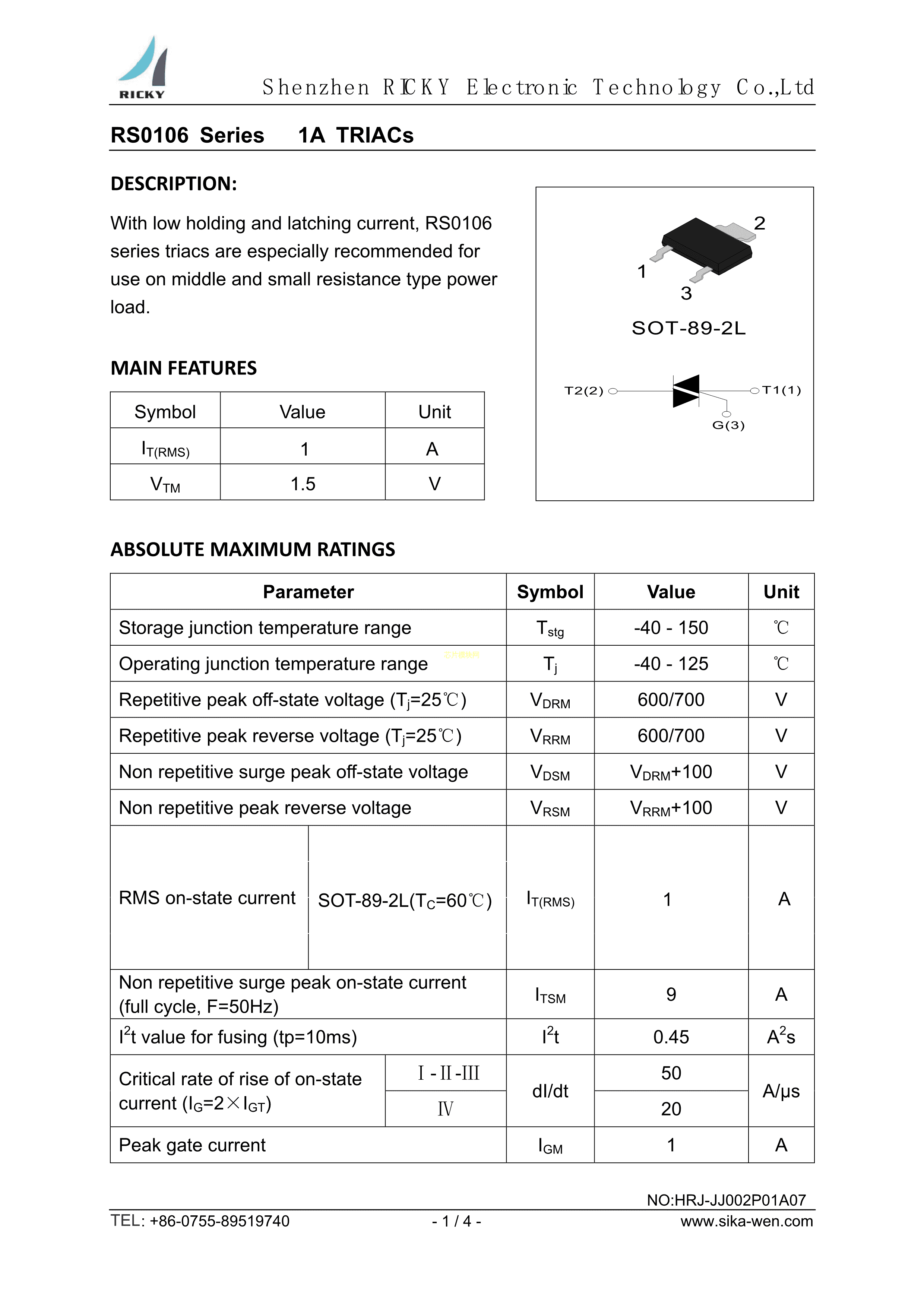 RS0106T-N数据手册SOT-89-2L封装RICKYPDF规格书,中英文下载