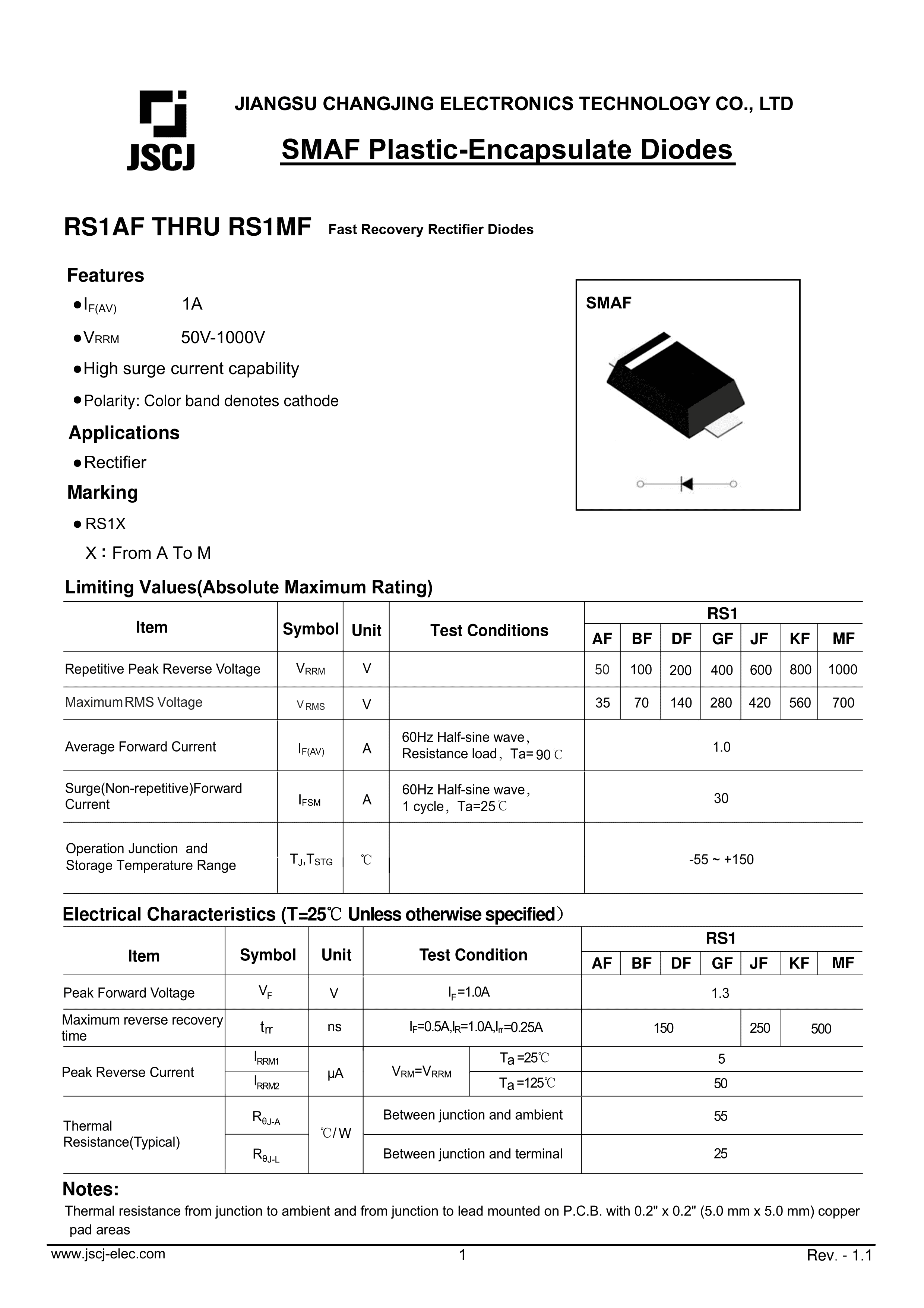 RS1JF数据手册SMAF封装CJ(江苏长电-长晶)PDF规格书,中英文下载