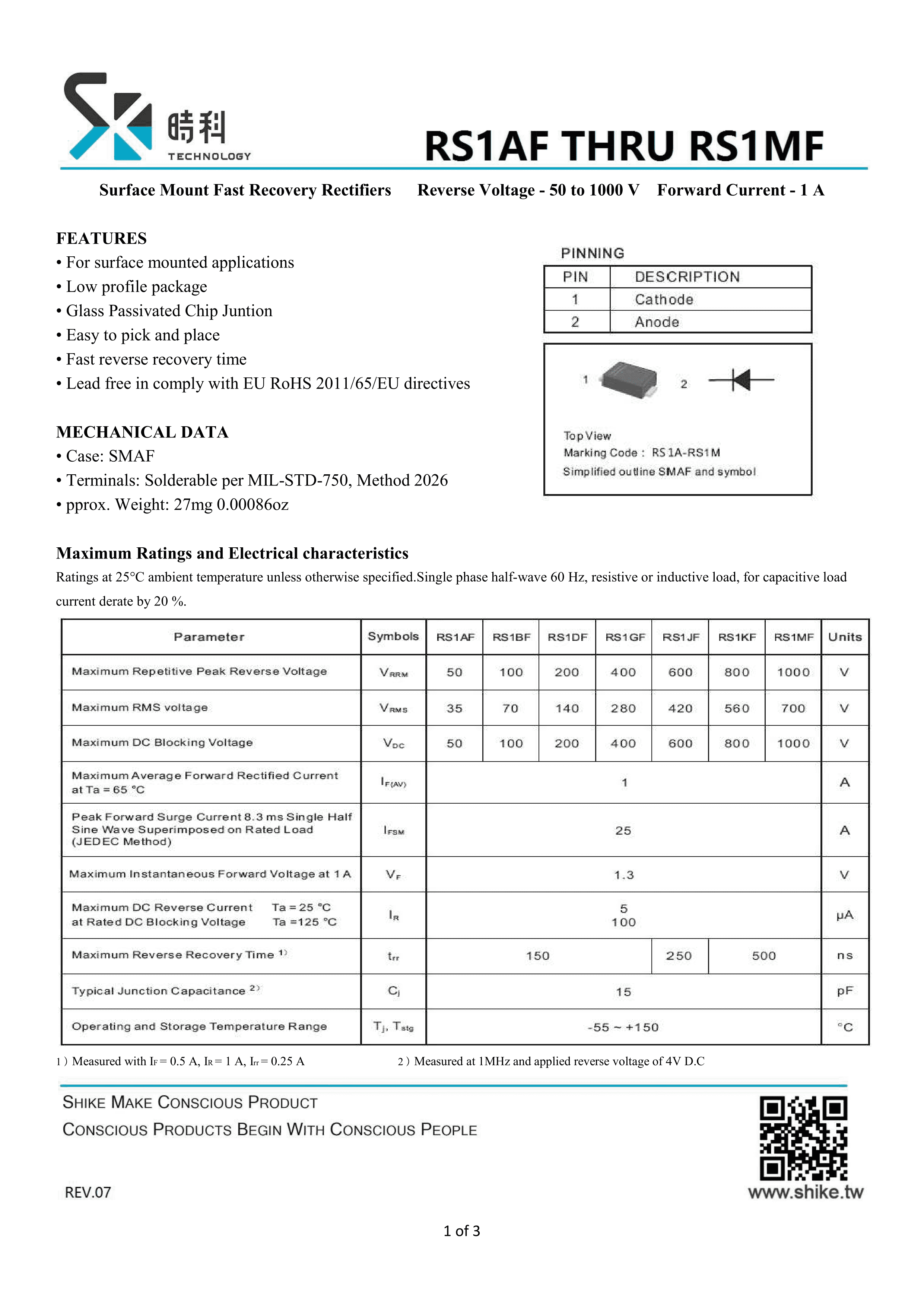 RS1JF数据手册SMAF封装SHIKUES(时科)PDF规格书,中英文下载