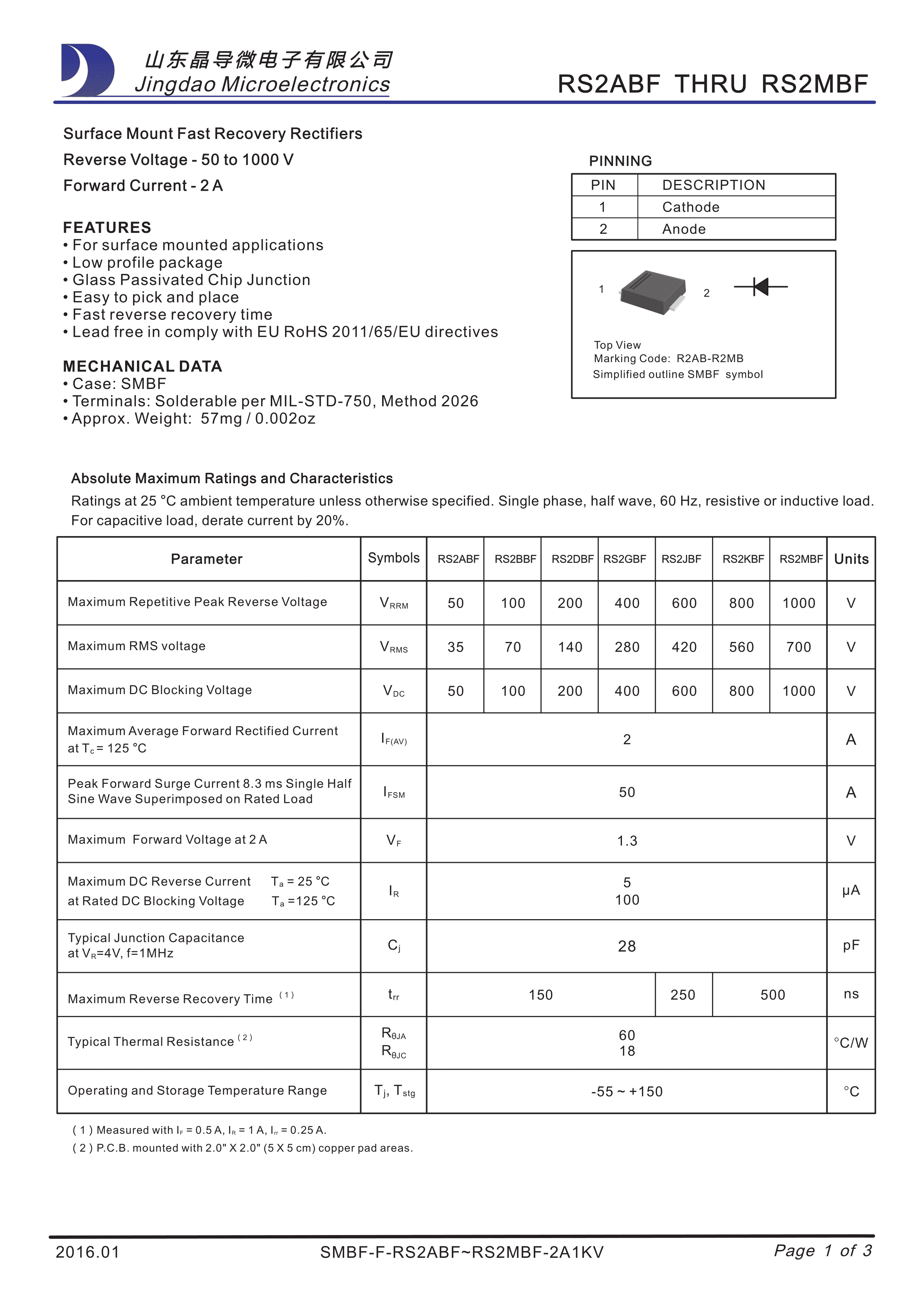 RS2JBF数据手册SMBF封装晶导微电子PDF规格书,中英文下载