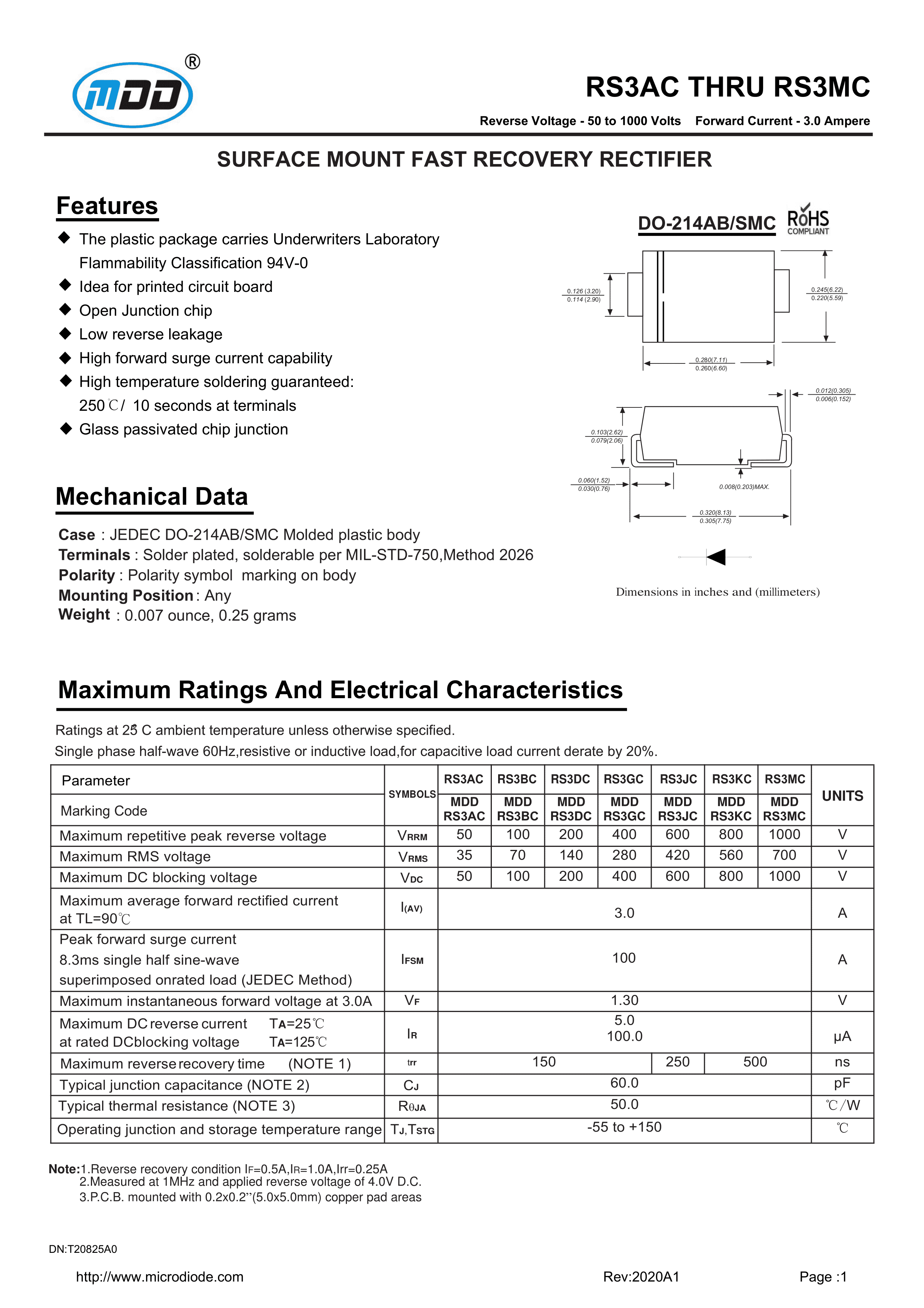 RS3GC数据手册SMC封装MDDPDF规格书,中英文下载