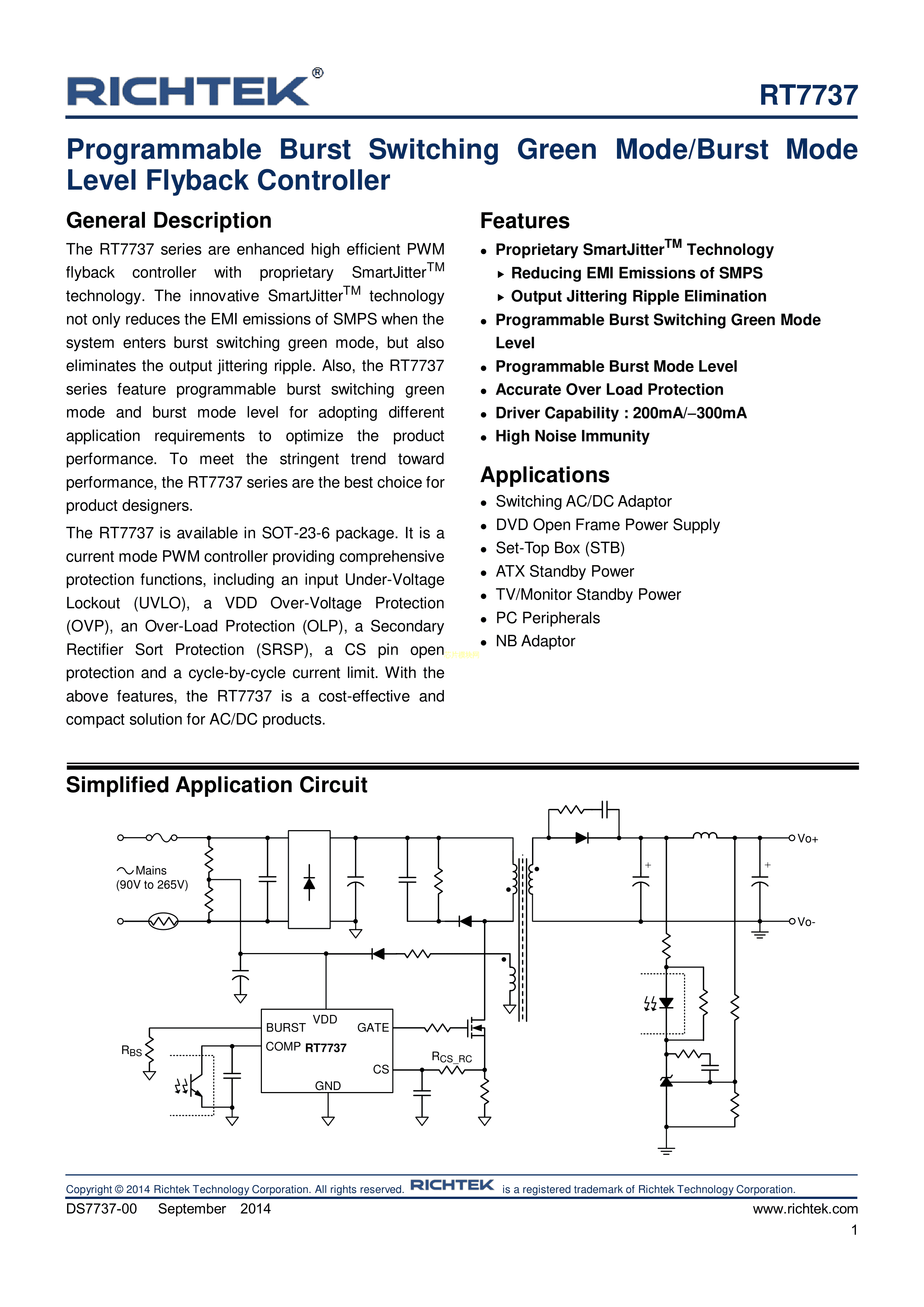 RT7737GGE数据手册SOT-23-6封装RICHTEK(台湾立锜)PDF规格书,中英文下载
