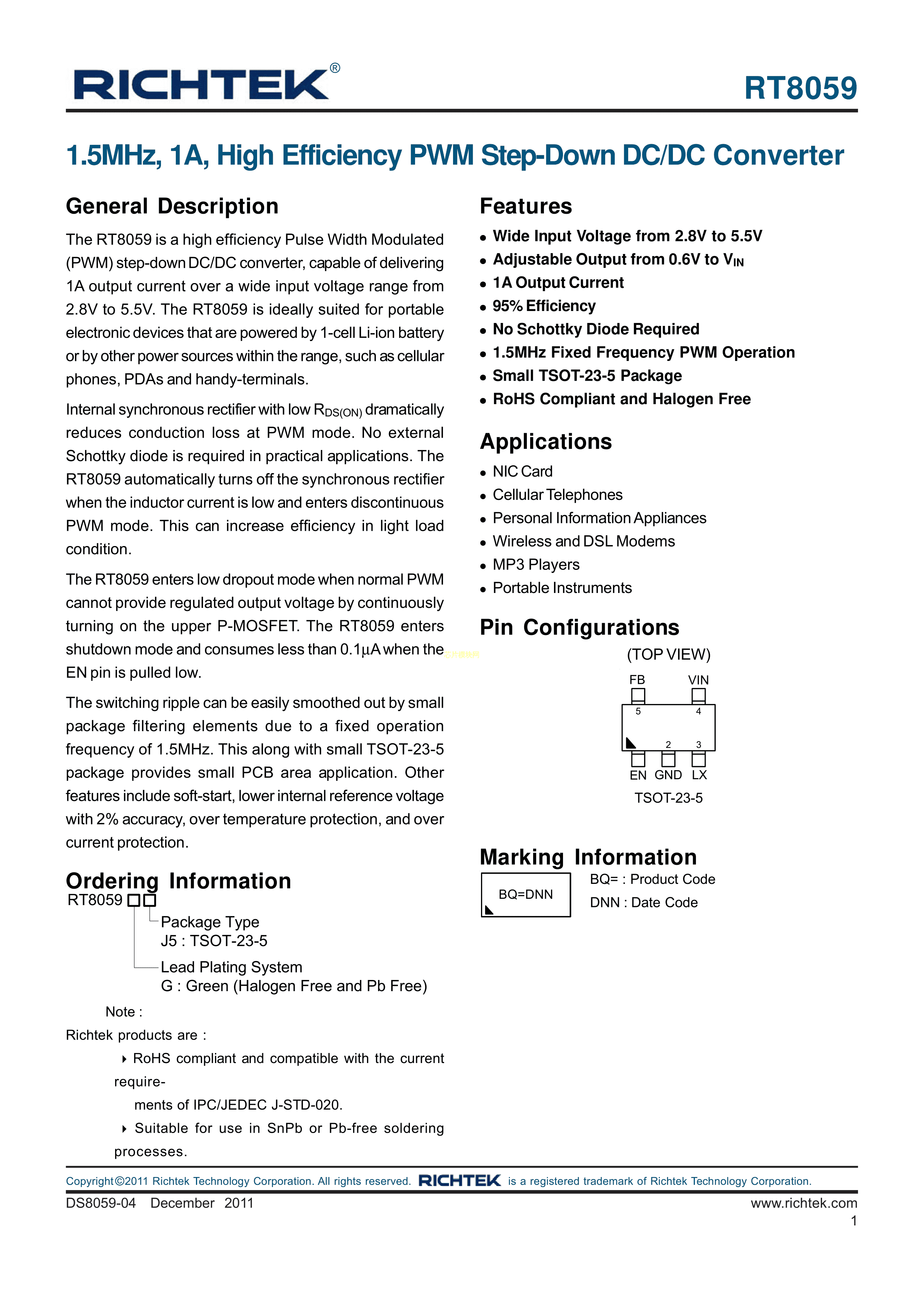 RT8059GJ5数据手册SOT-23-5封装RICHTEK(台湾立锜)PDF规格书,中英文下载