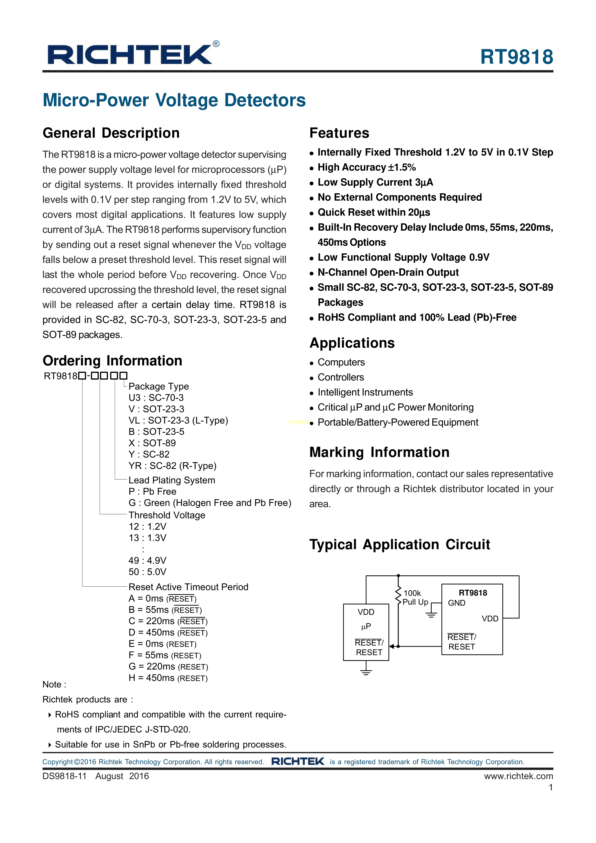 RT9818B-18GV数据手册SOT-23-3封装RICHTEK(台湾立锜)PDF规格书,中英文下