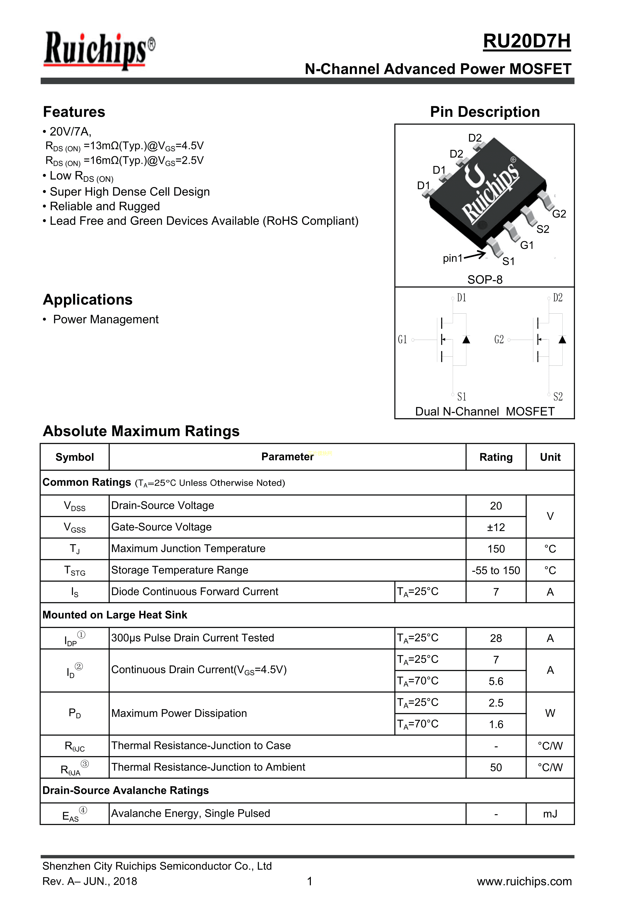 RU20D7H数据手册SOP-8封装Ruichips(锐骏半导体)PDF规格书,中英文下载