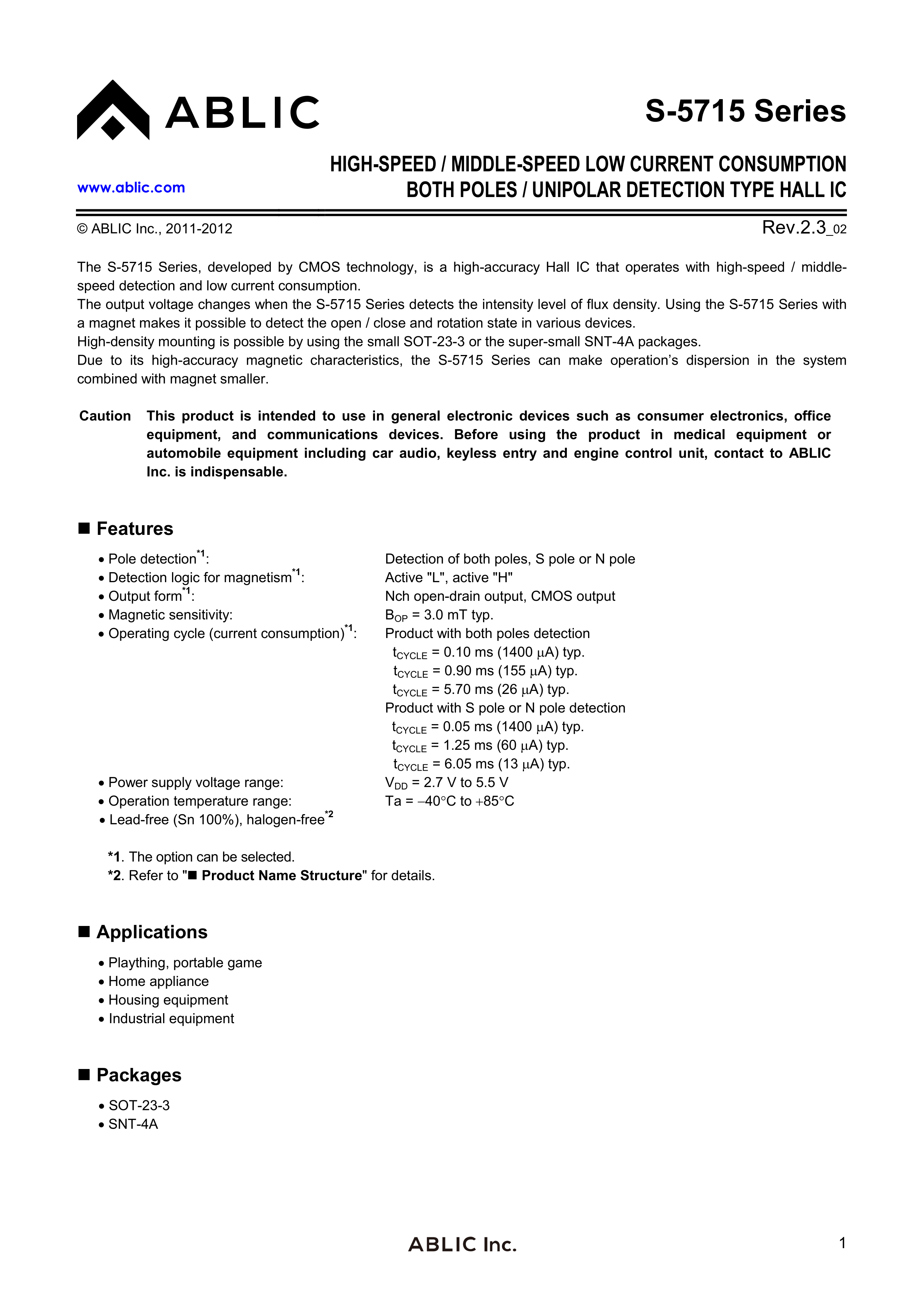 S-5715CNDL1-M3T1U数据手册SOT-23-3封装ABLIC(艾普凌科)PDF规格书,中