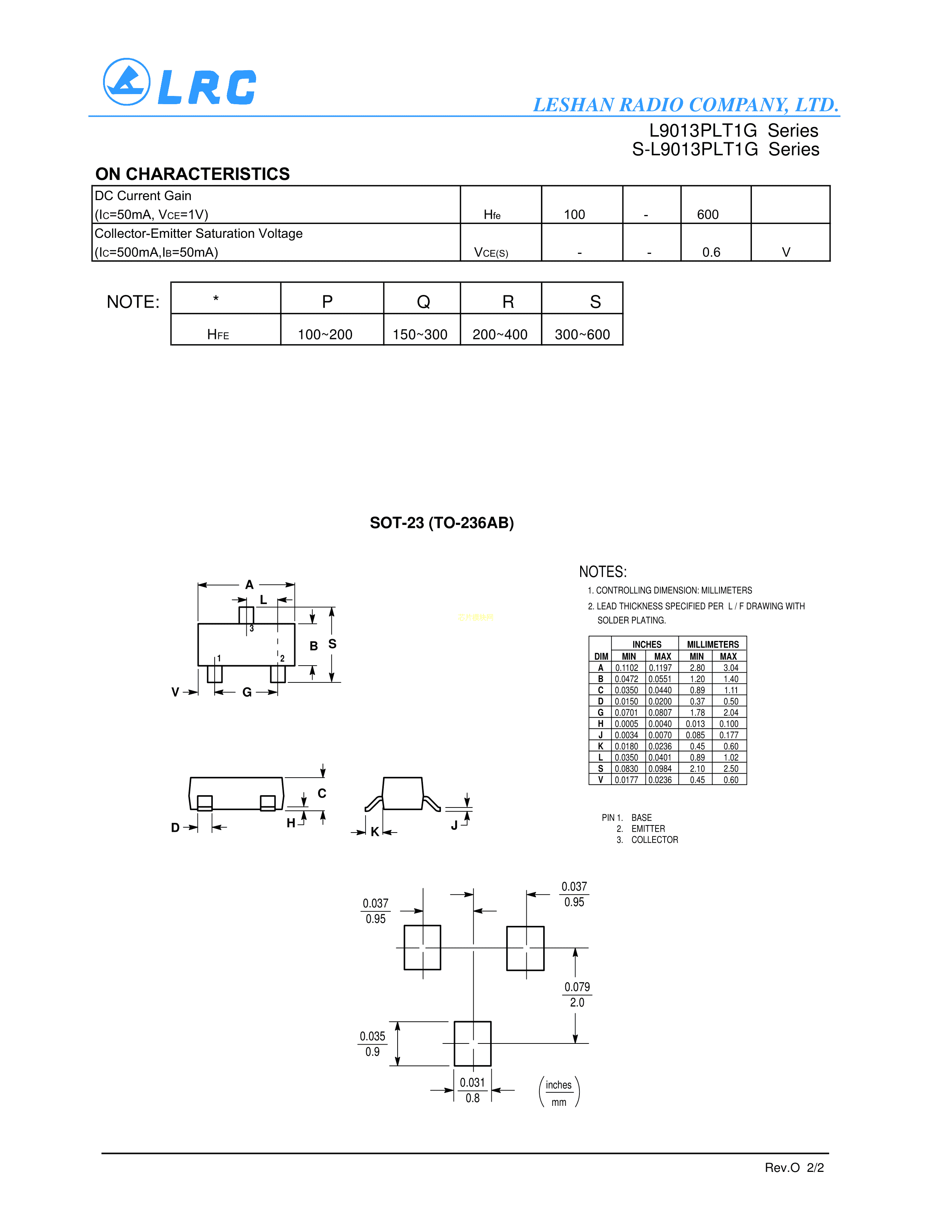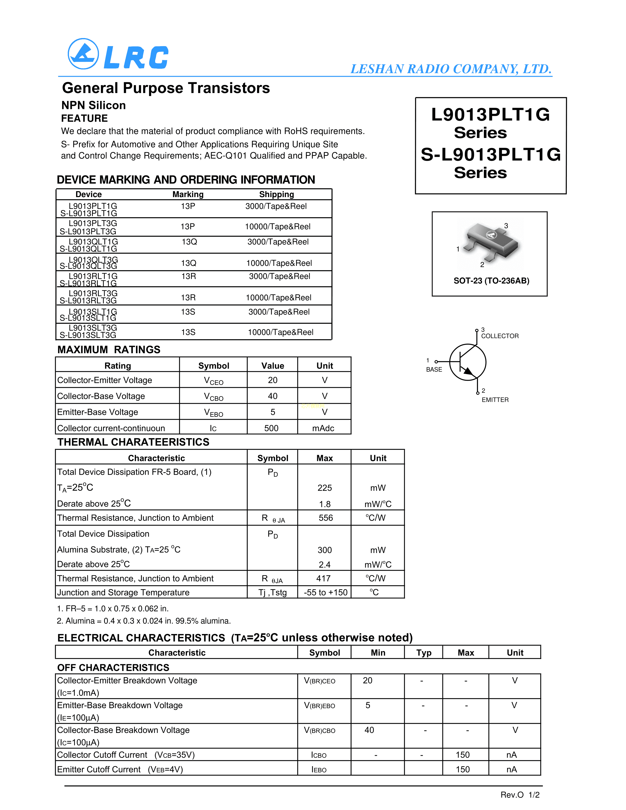 S-L9013QLT1G数据手册SOT-23封装LRC(乐山无线电)PDF规格书,中英文下载