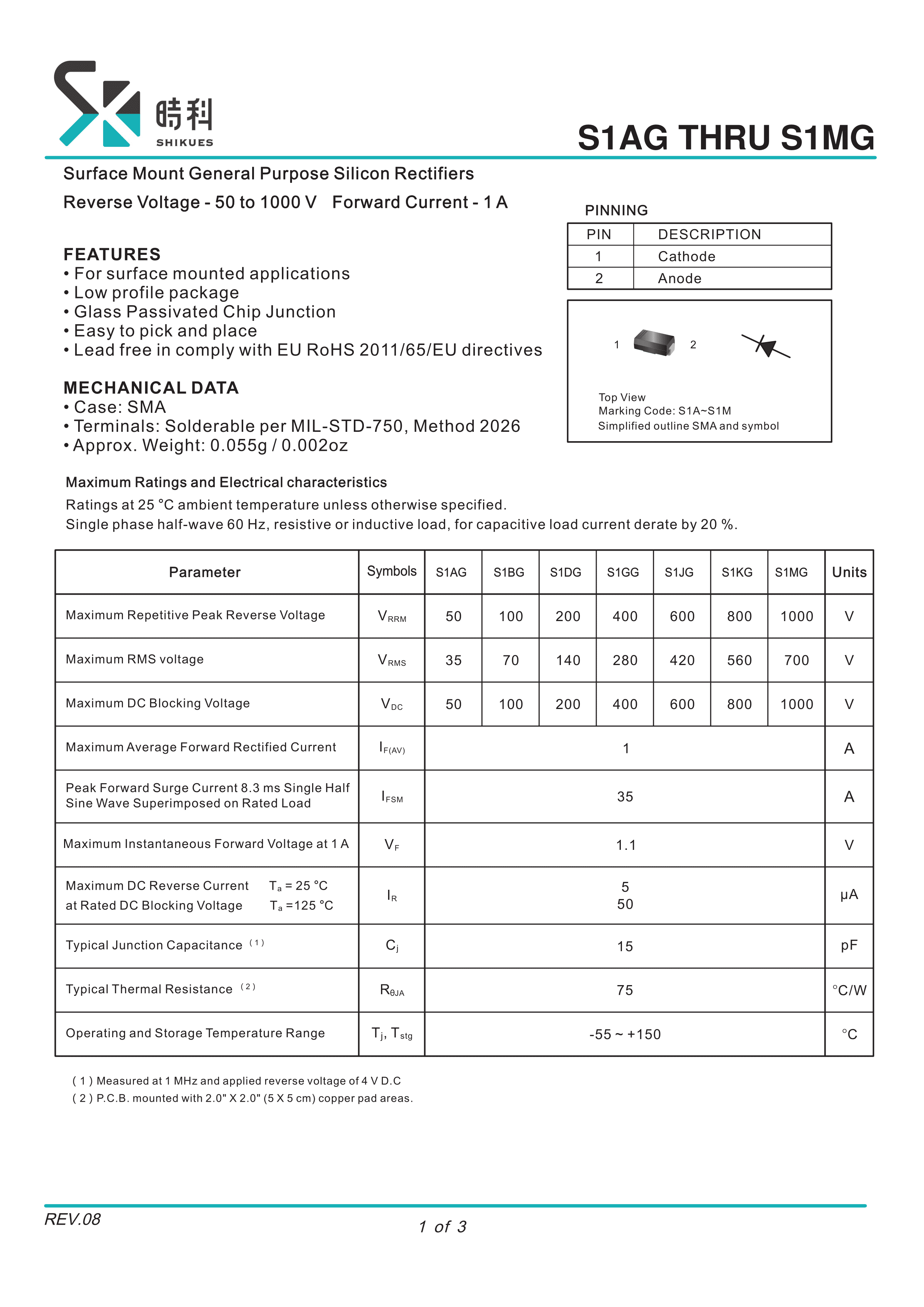 S1DG数据手册SMA(DO-214AC)封装SHIKUES(时科)PDF规格书,中英文下载