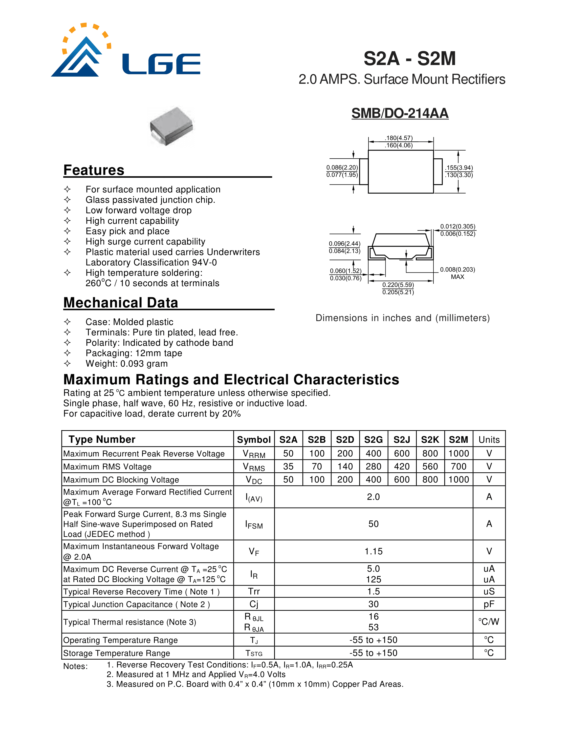 S2B数据手册SMB(DO-214AA)封装LGE(鲁光)PDF规格书,中英文下载