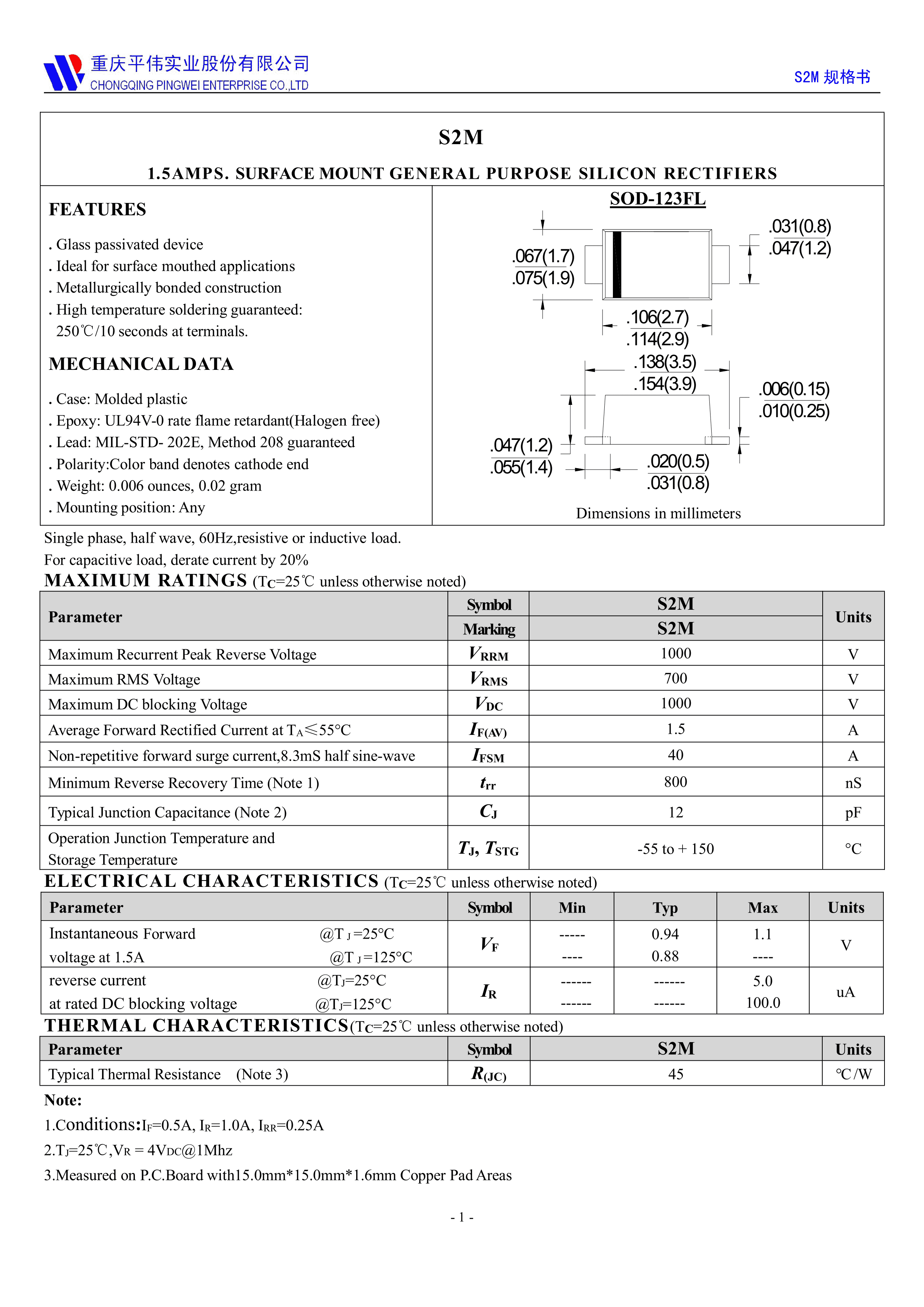 S2M数据手册SOD-123FL封装PINGWEI(平伟)PDF规格书,中英文下载