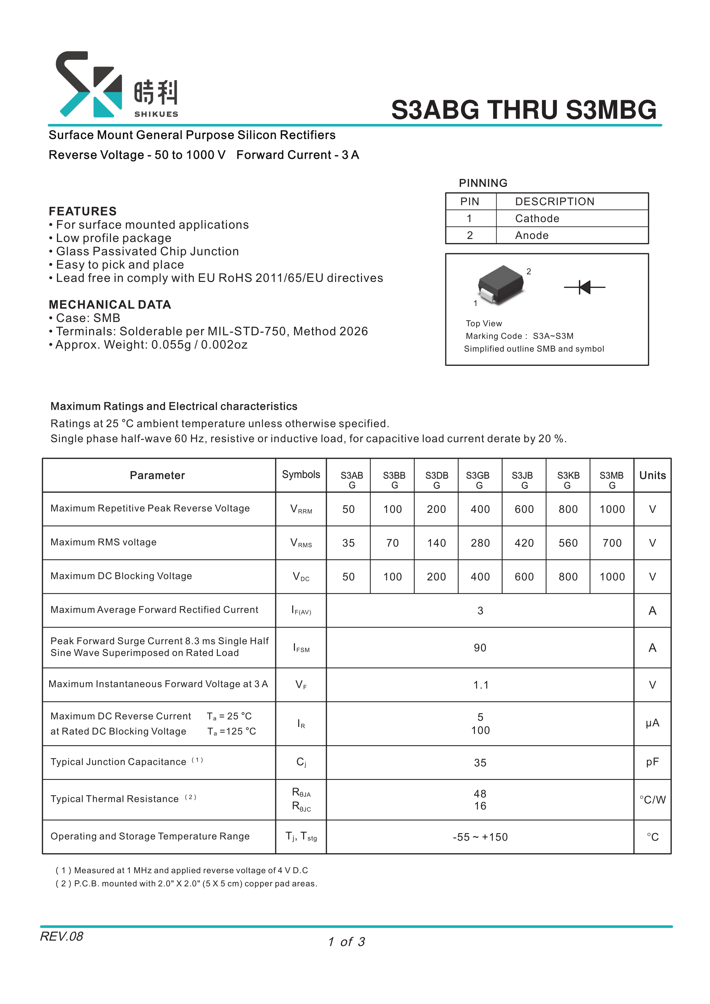 S3BBG数据手册SMB(DO-214AA)封装SHIKUES(时科)PDF规格书,中英文下载