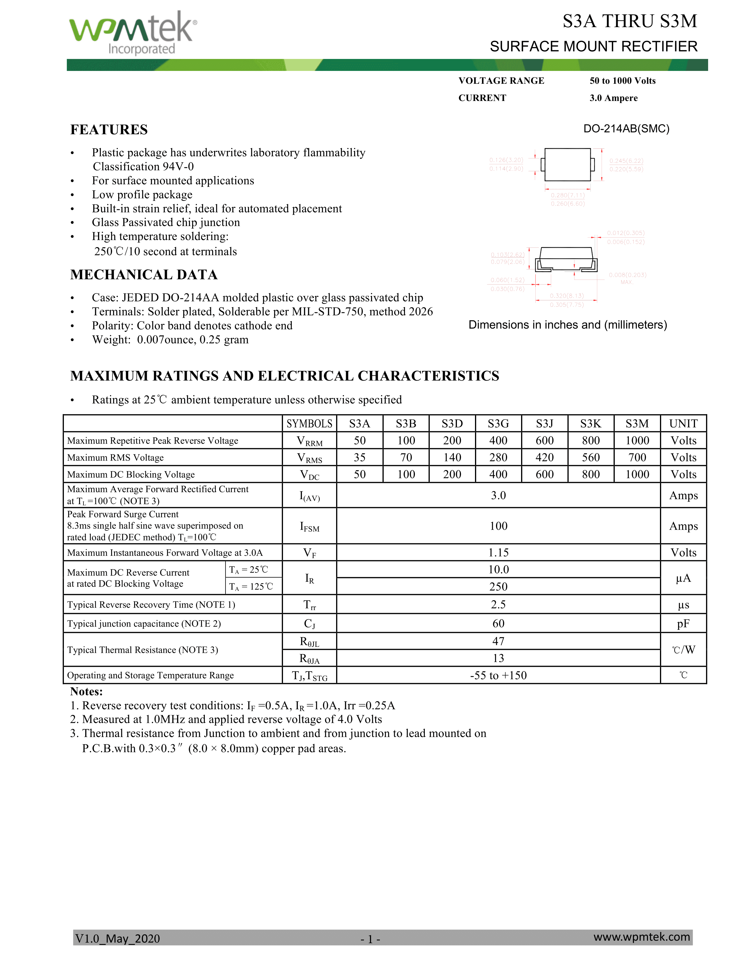 S3J数据手册SMC(DO-214AB)封装WPMtek(维攀微)PDF规格书,中英文下载