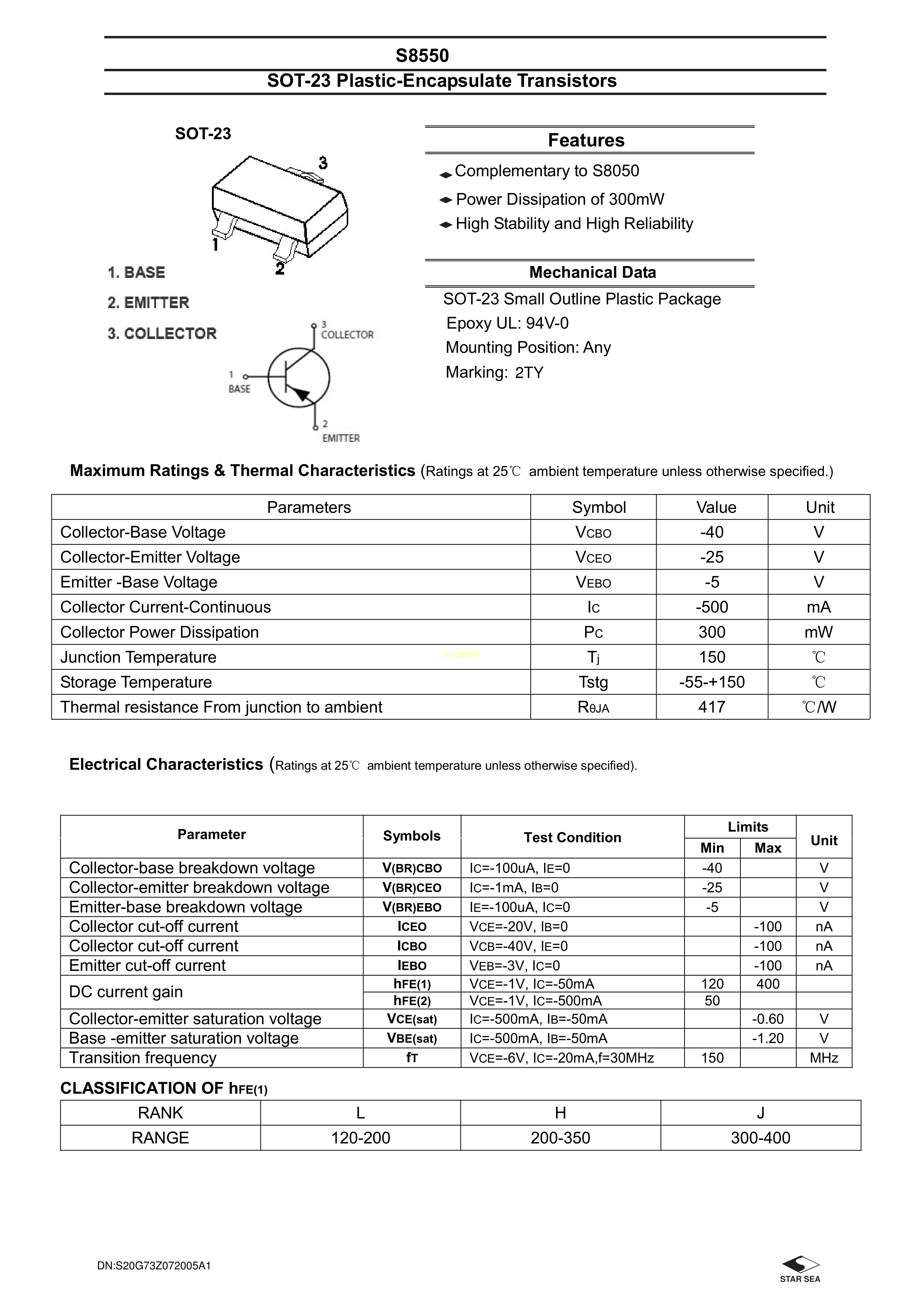 S8550数据手册SOT-23封装星海PDF规格书,中英文下载