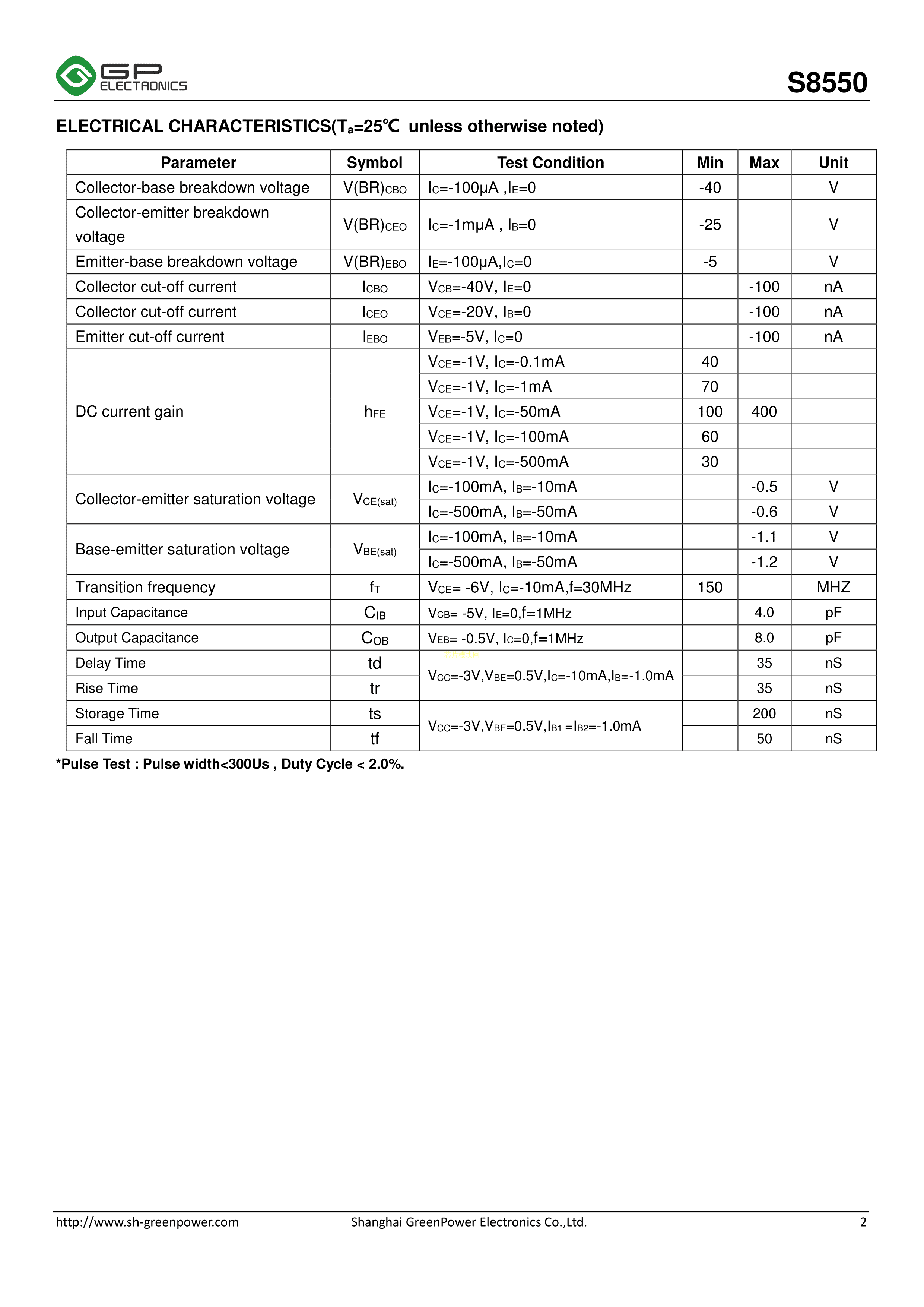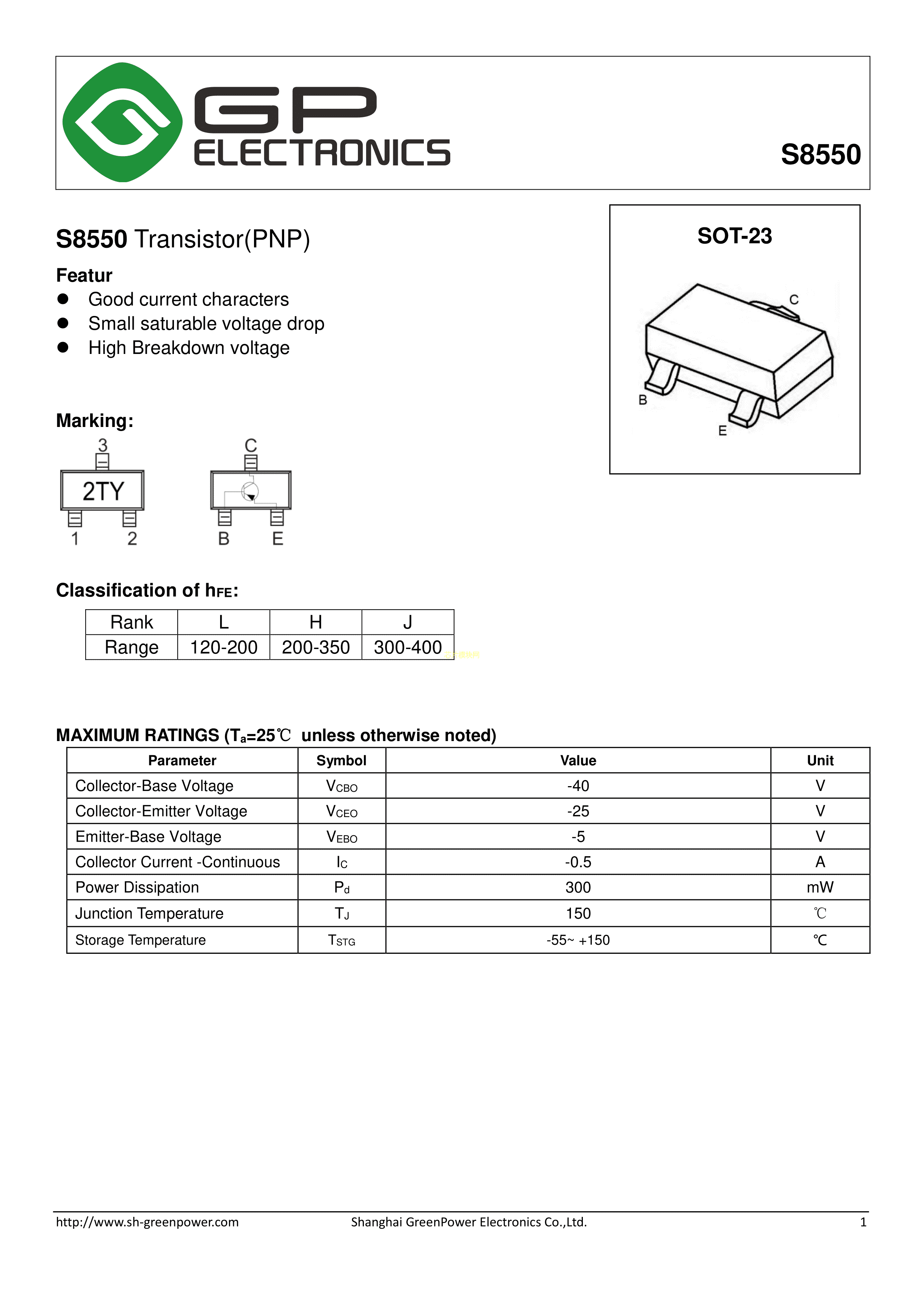 S8550数据手册SOT-23封装GP(格瑞宝)PDF规格书,中英文下载