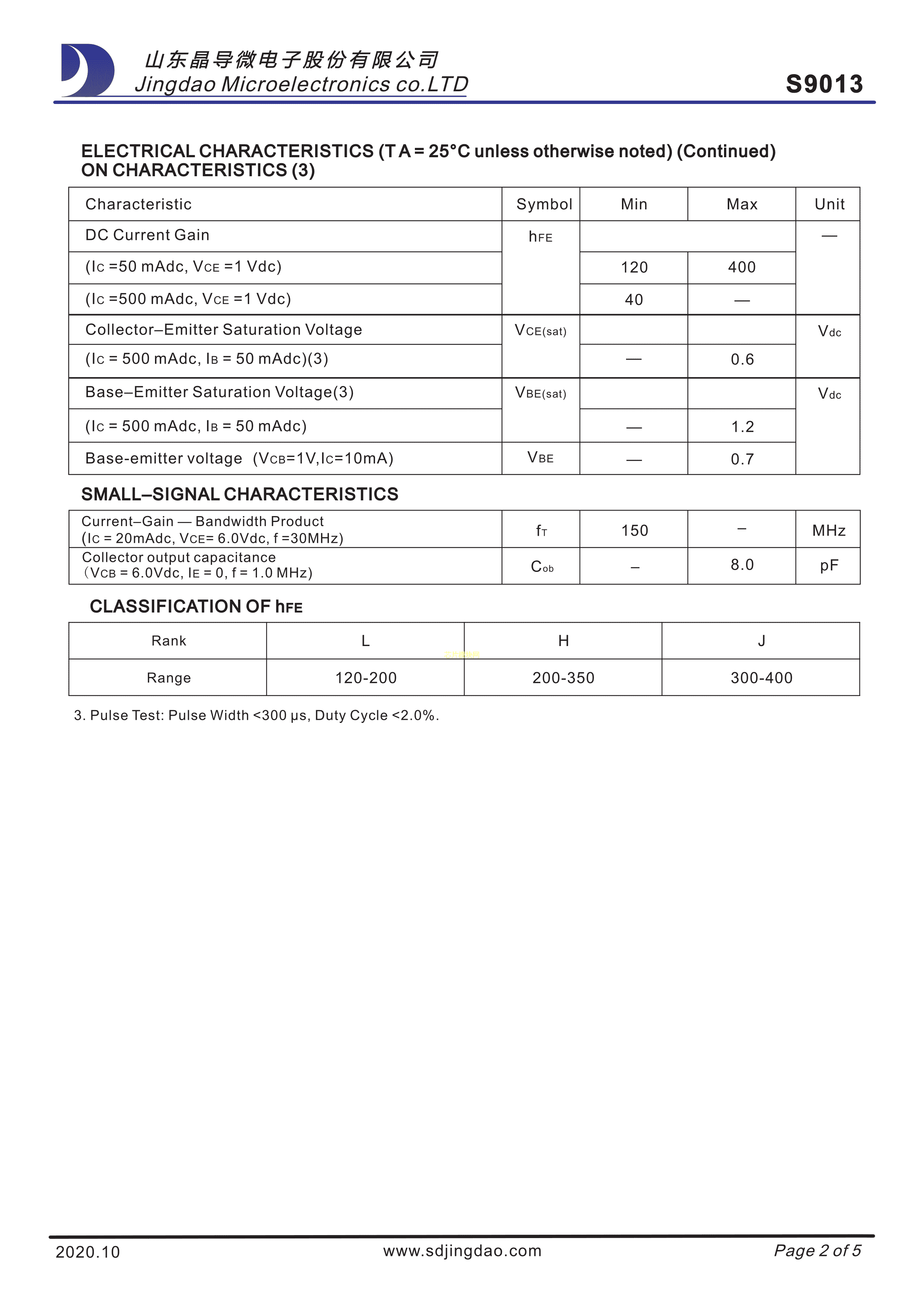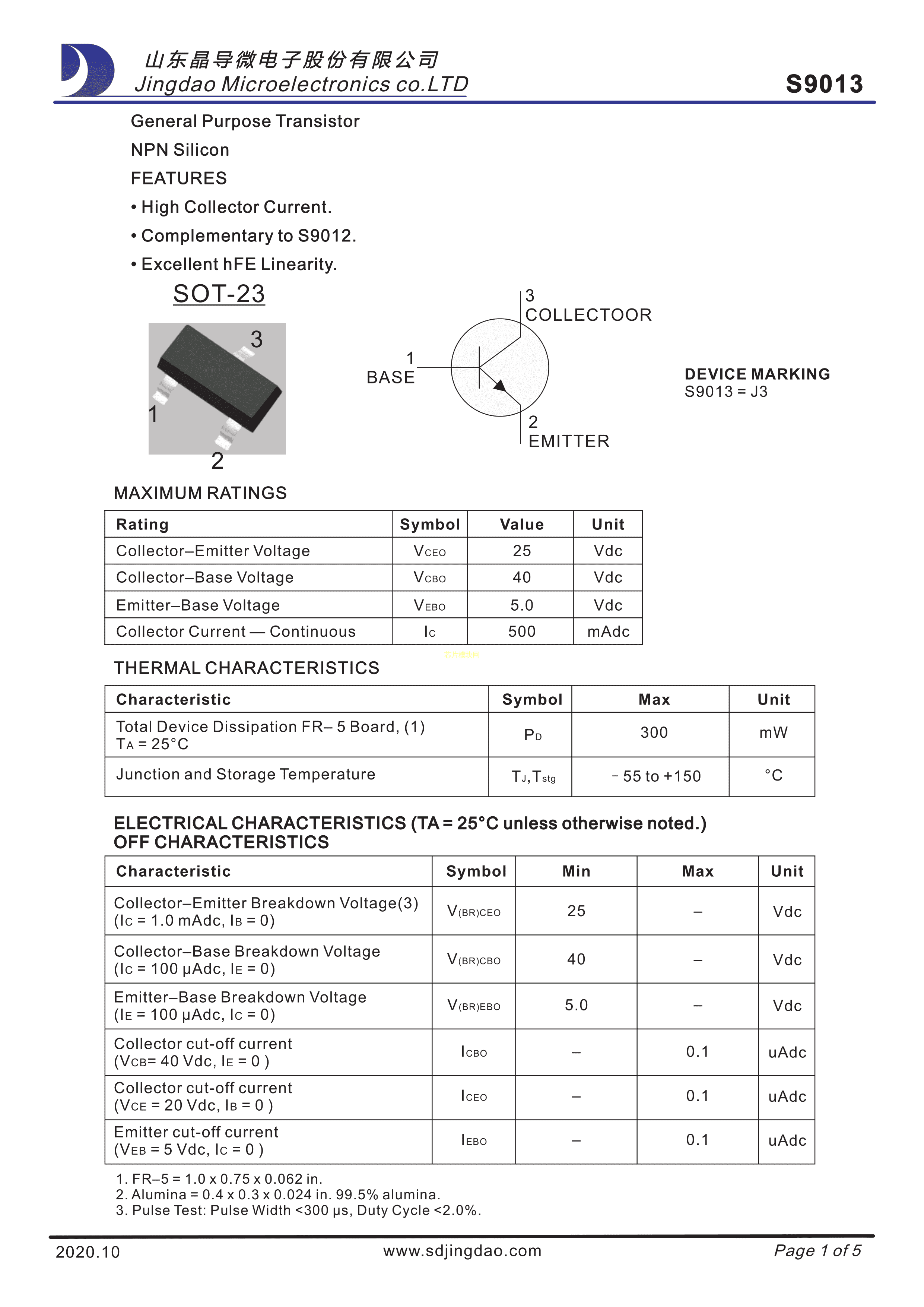 S9013数据手册SOT-23封装晶导微电子PDF规格书,中英文下载