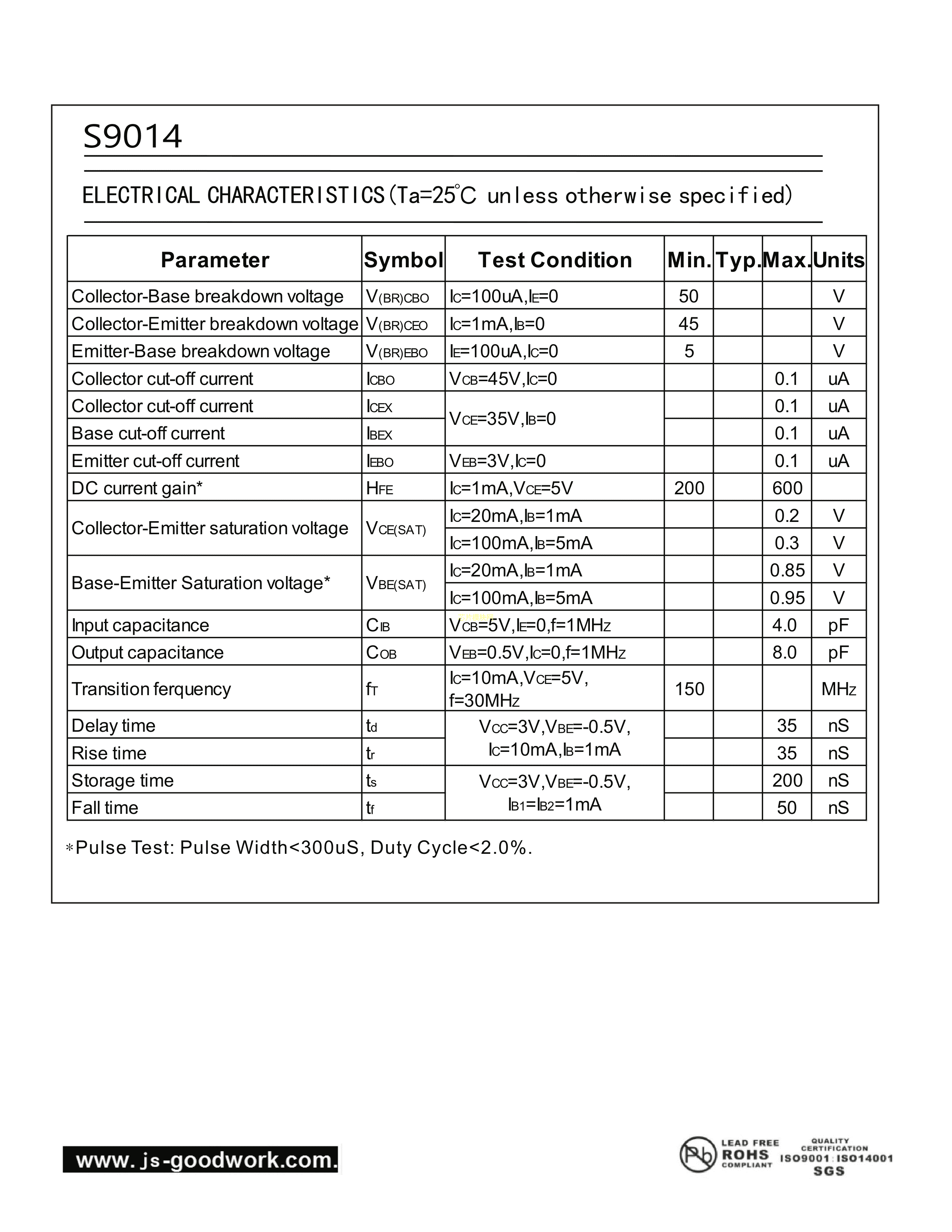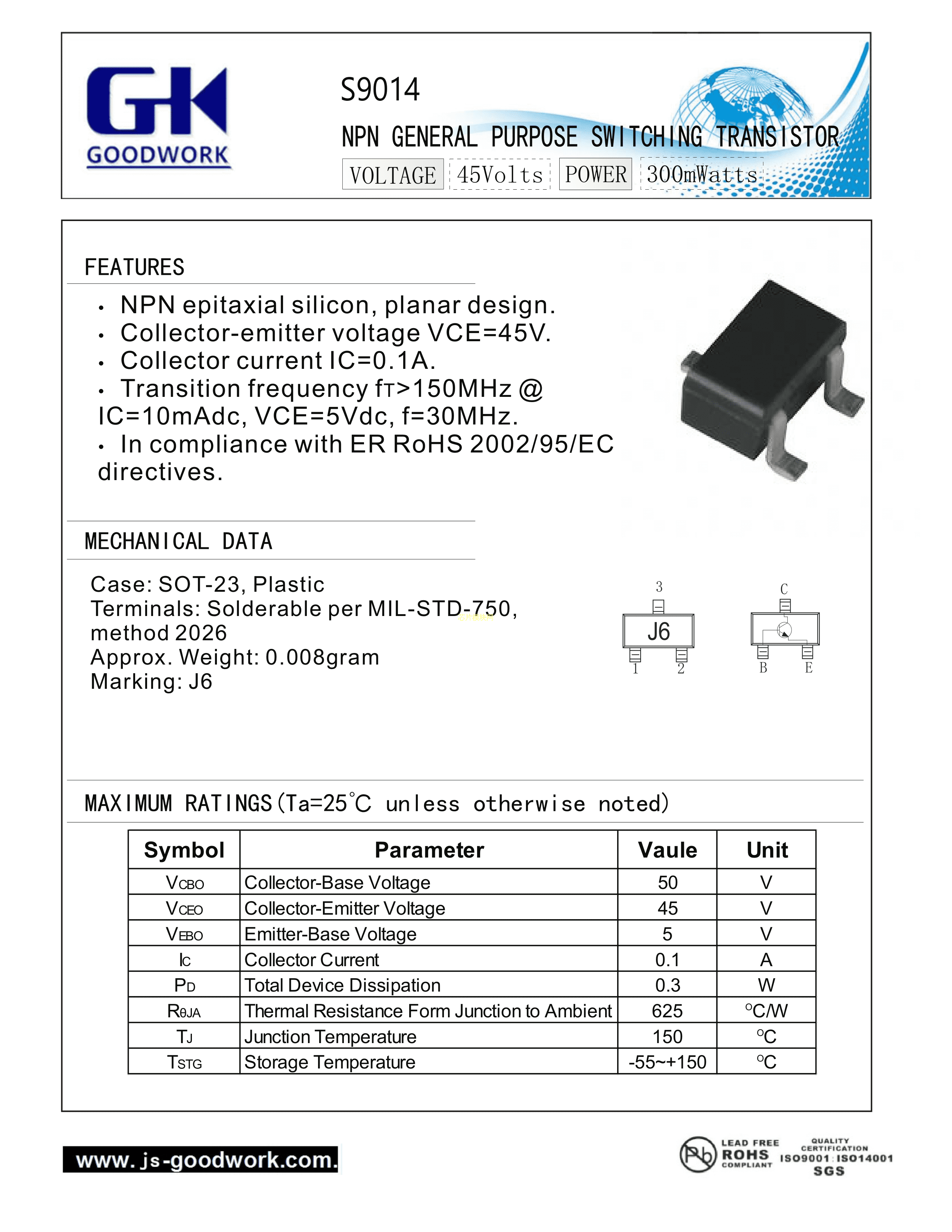 S9014数据手册SOT-23封装GOODWORK(固得沃克)PDF规格书,中英文下载