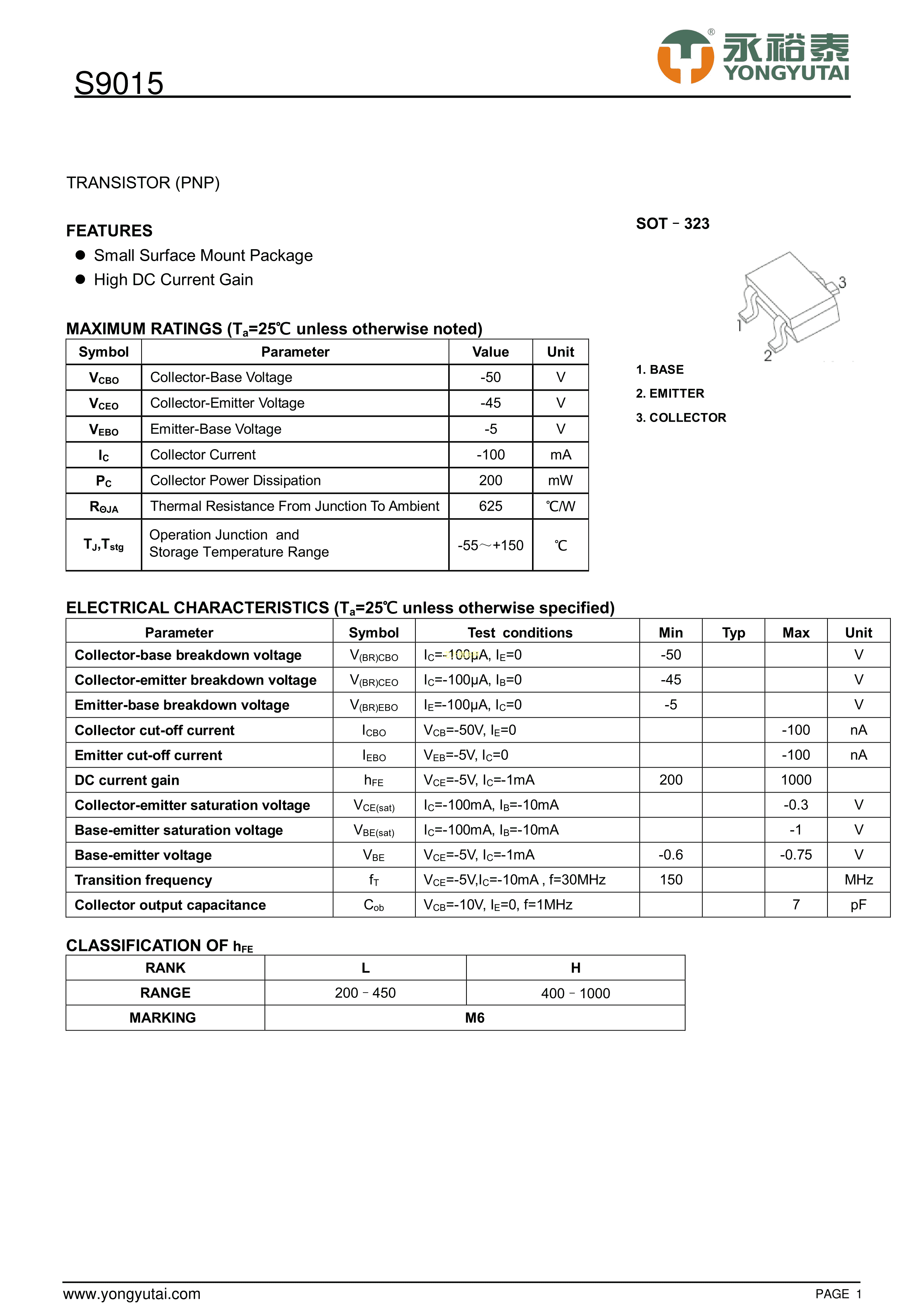 S9015数据手册SOT-323封装YONGYUTAI(永裕泰)PDF规格书,中英文下载
