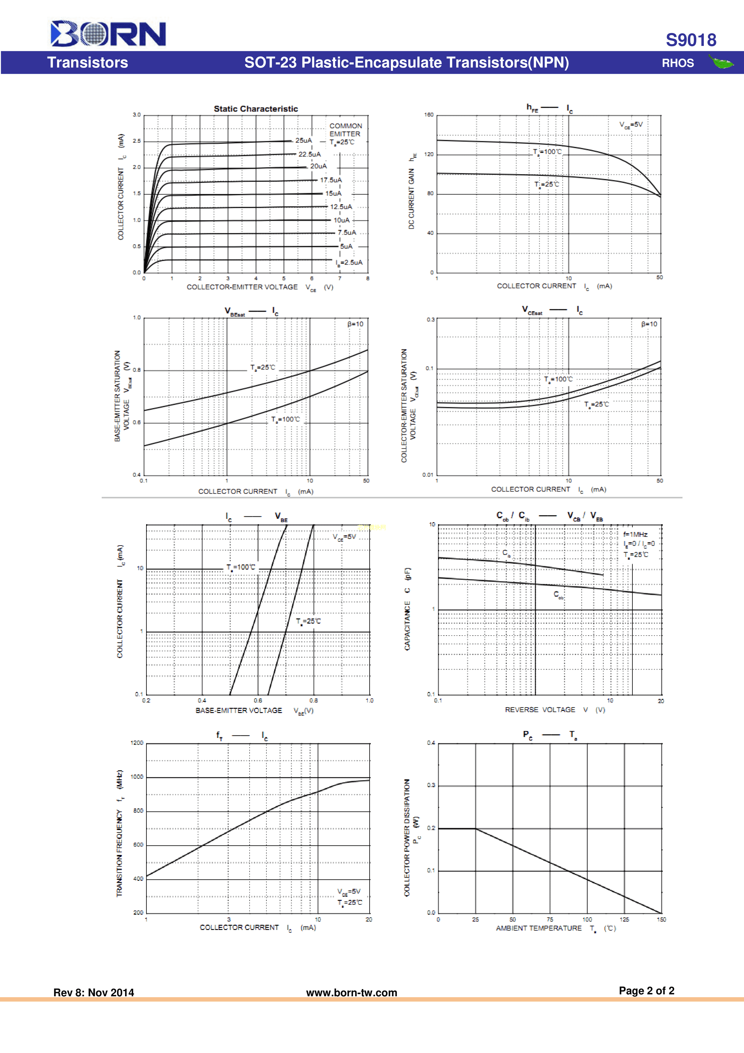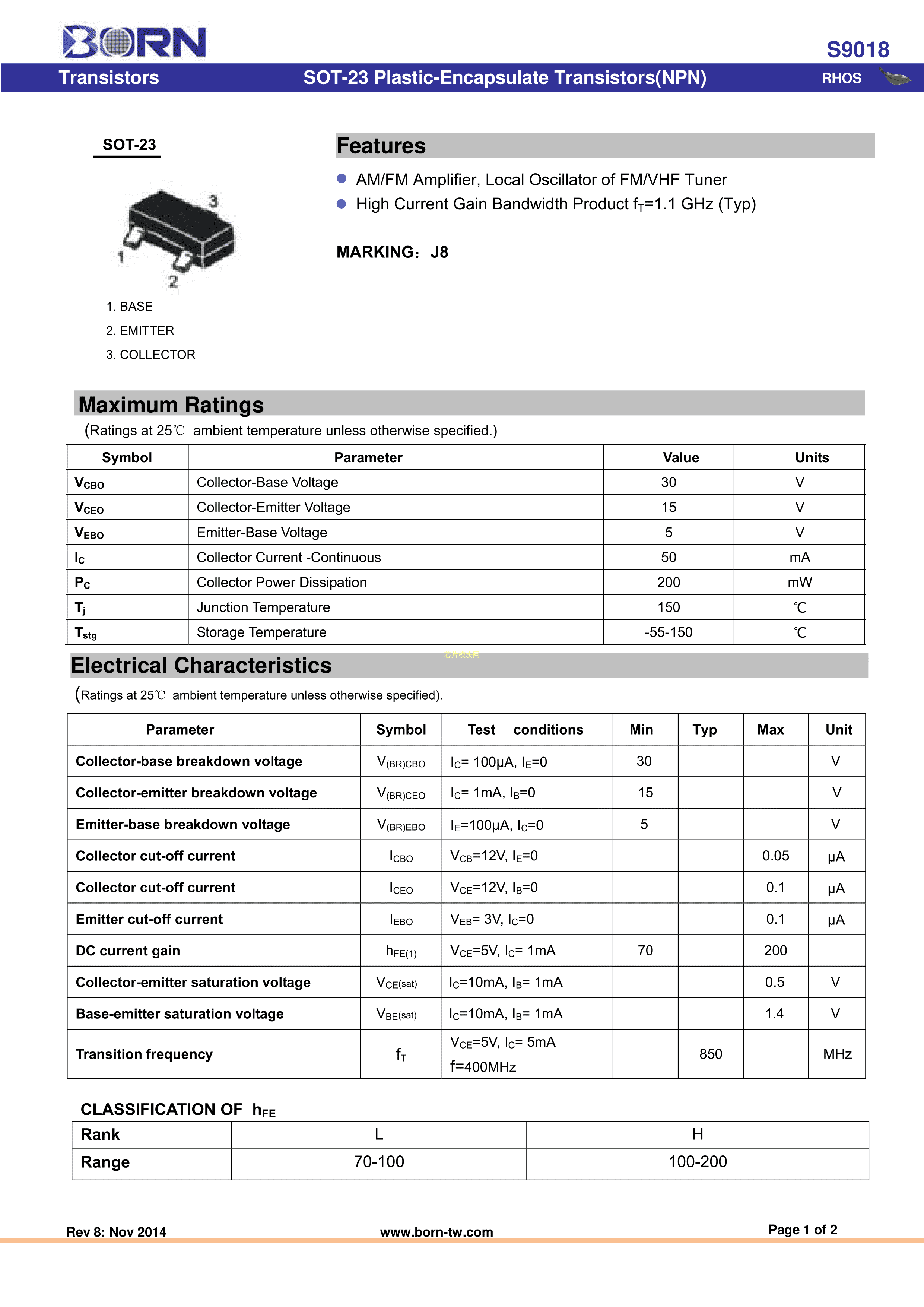 S9018数据手册SOT-23封装BORN(伯恩半导体)PDF规格书,中英文下载