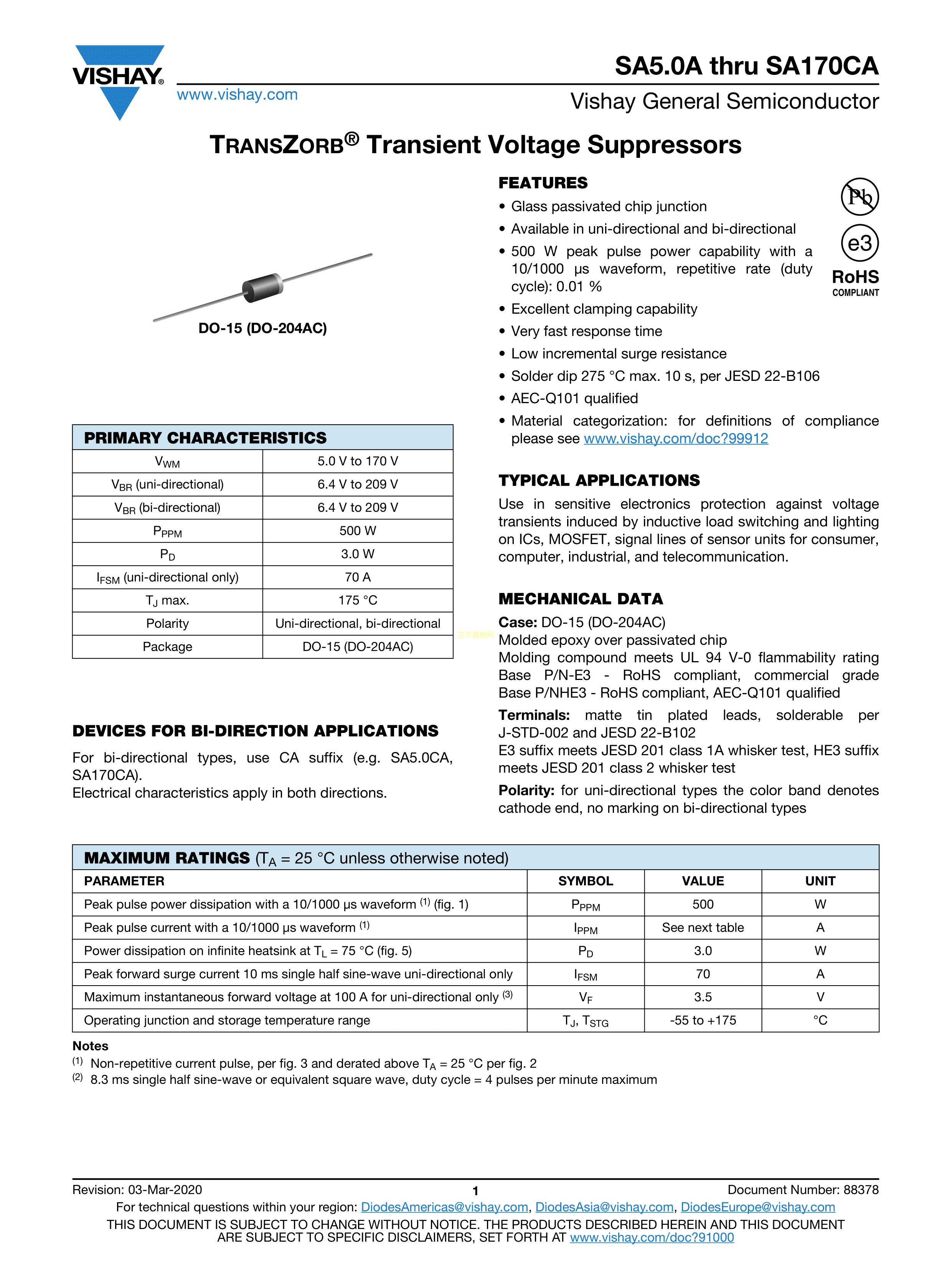 SA13A-E3-54数据手册DO-15(DO-204AC)封装VISHAY(威世)PDF规格书,中