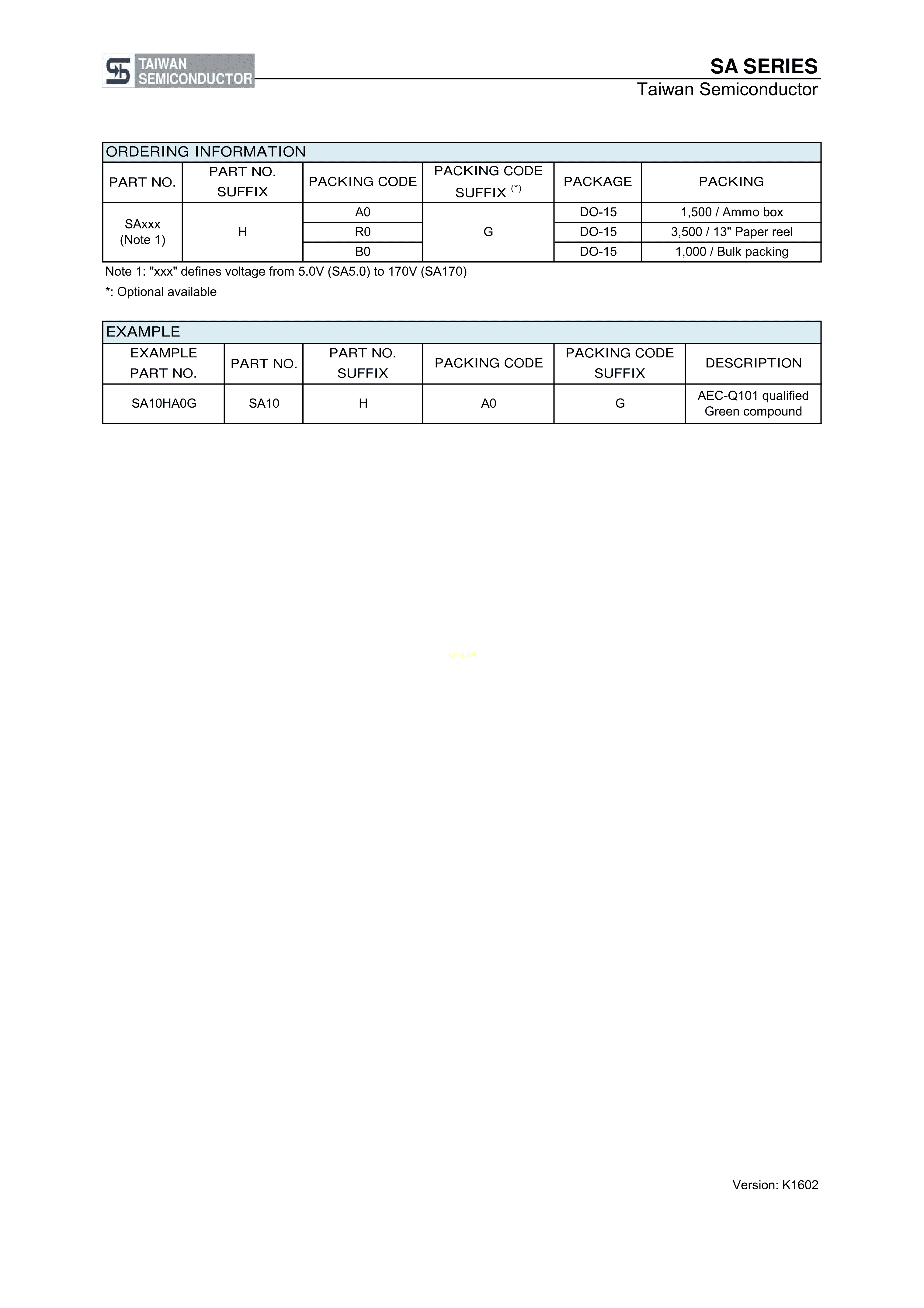 SA170A R0G数据手册DO-15(DO-204AC)封装Taiwan Semiconducto