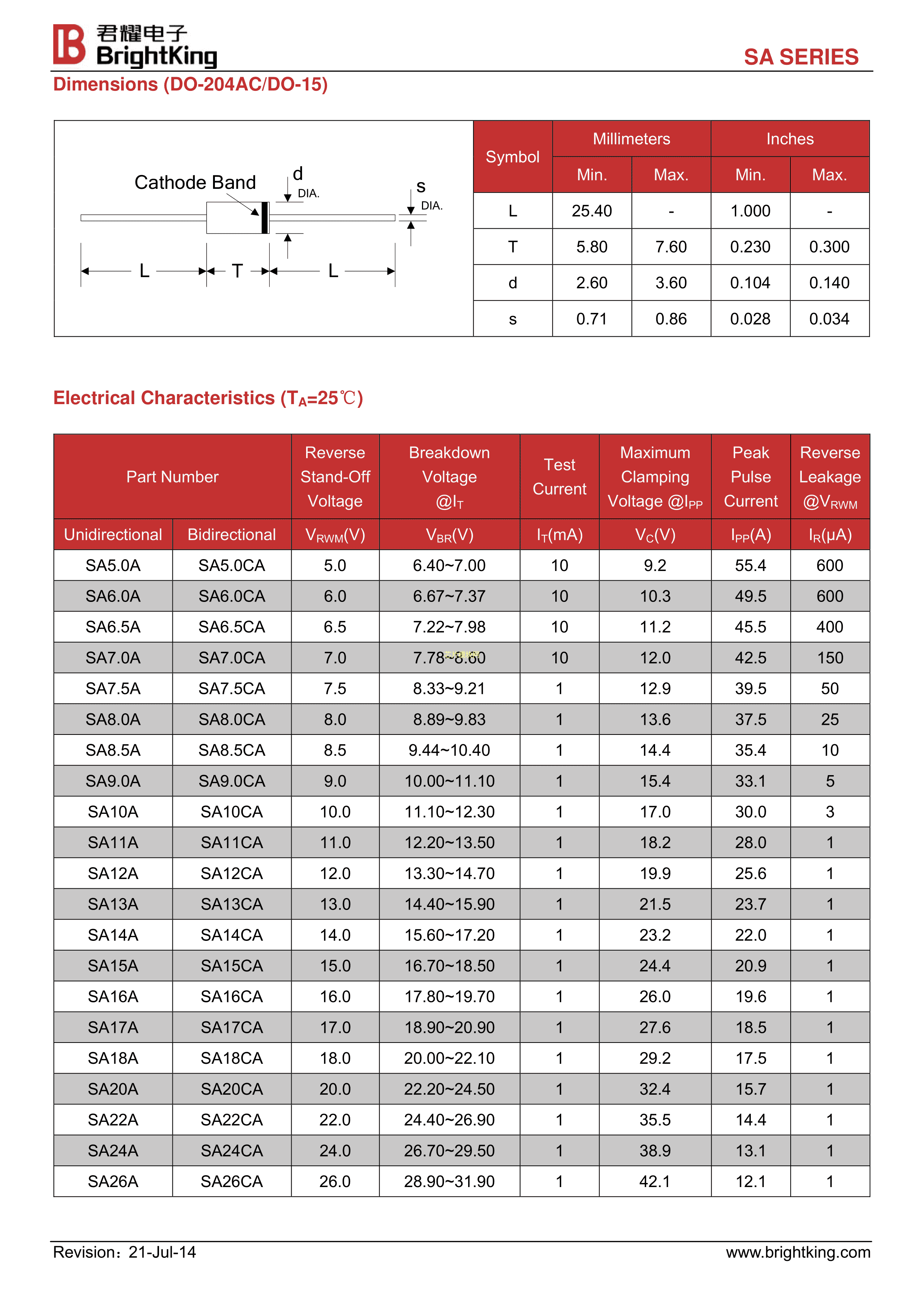 SA6.0A数据手册Axial封装Brightking(台湾君耀)PDF规格书,中英文下载