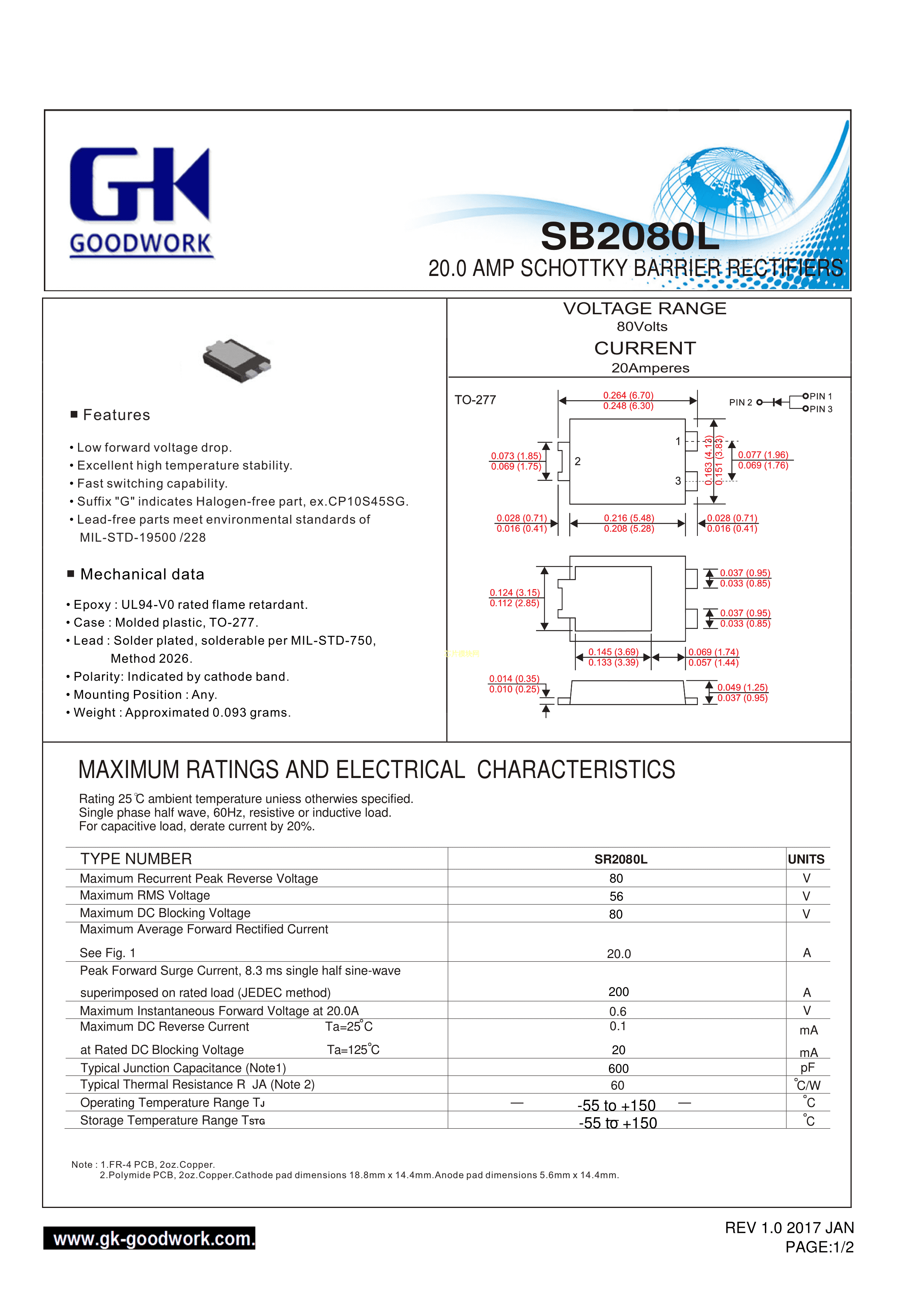 SB2080L数据手册TO-277封装GOODWORK(固得沃克)PDF规格书,中英文下载