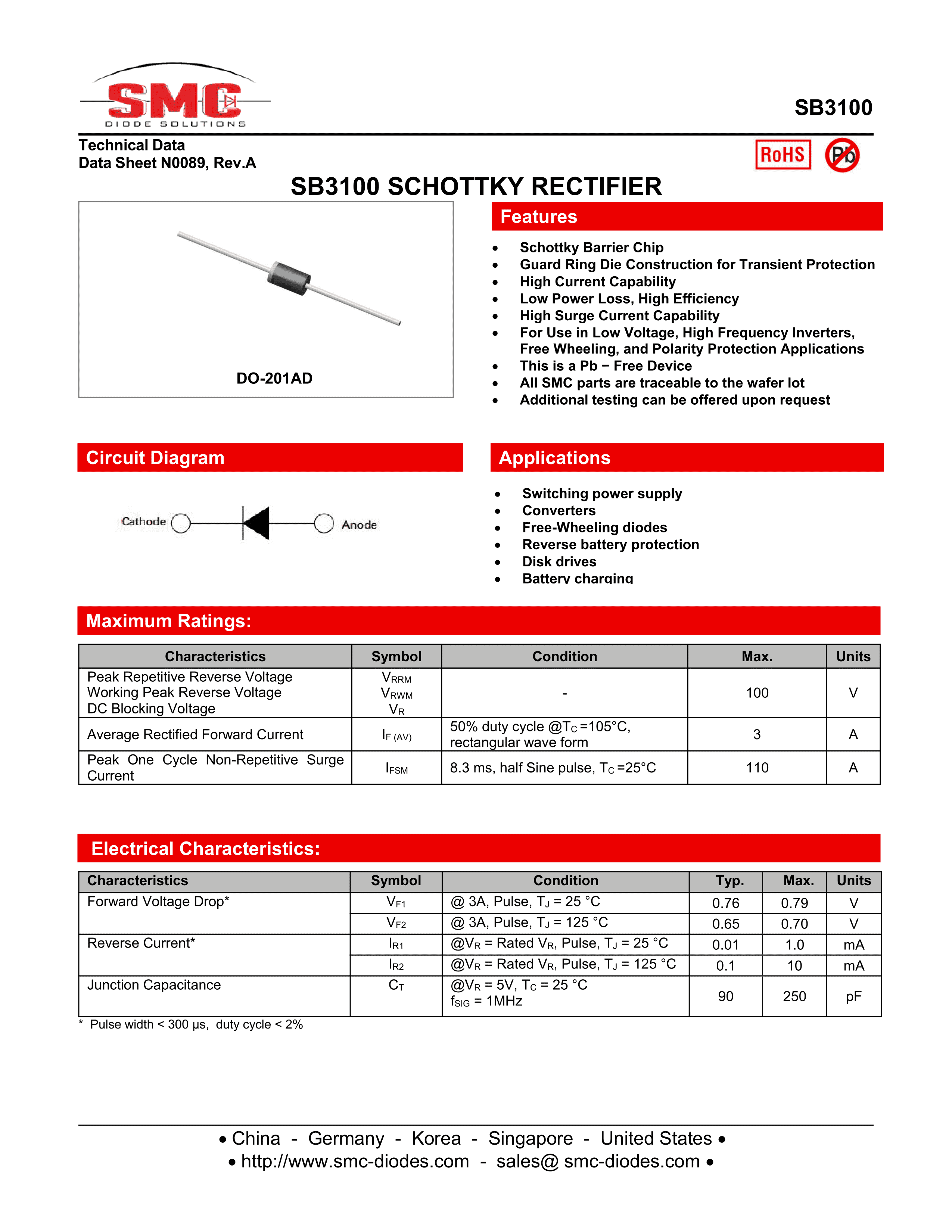 SB3100数据手册DO-201AD封装SMC(桑德斯)PDF规格书,中英文下载