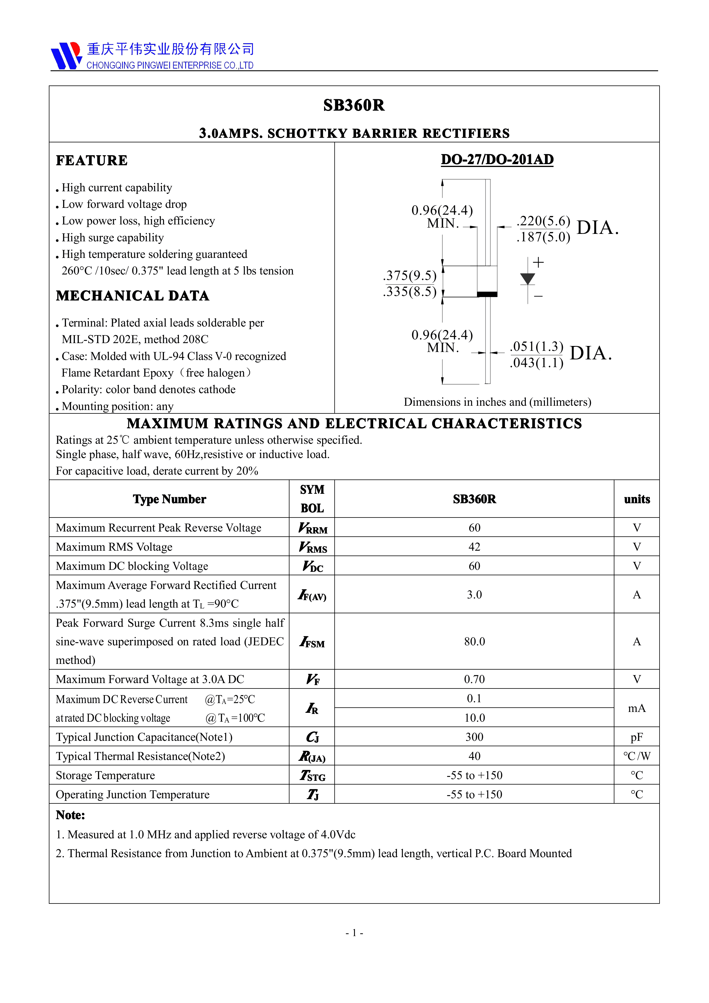 SB360R数据手册DO-27封装PINGWEI(平伟)PDF规格书,中英文下载