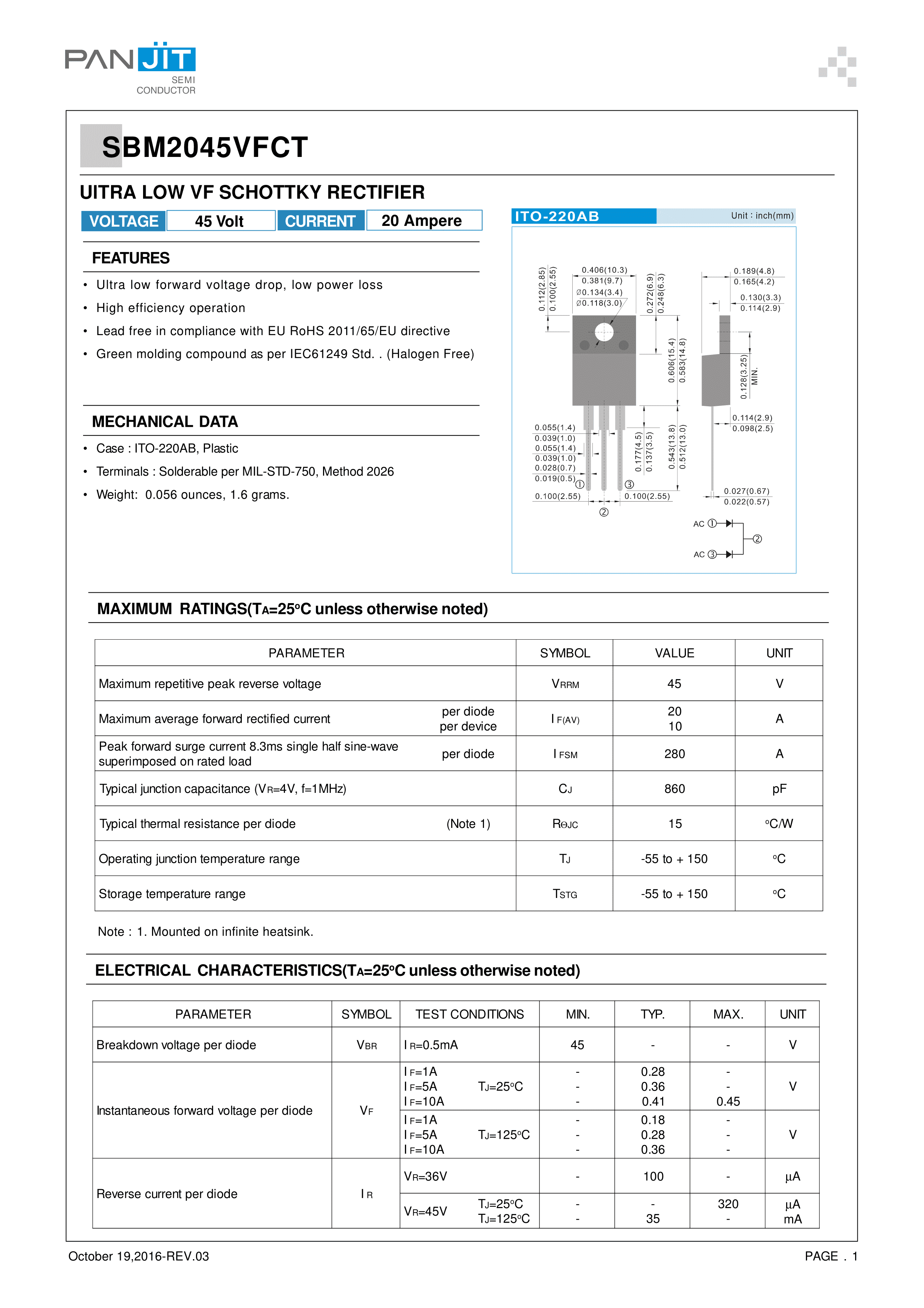 SBM2045VFCT数据手册ITO-220AB封装PANJIT(强茂)PDF规格书,中英文下载