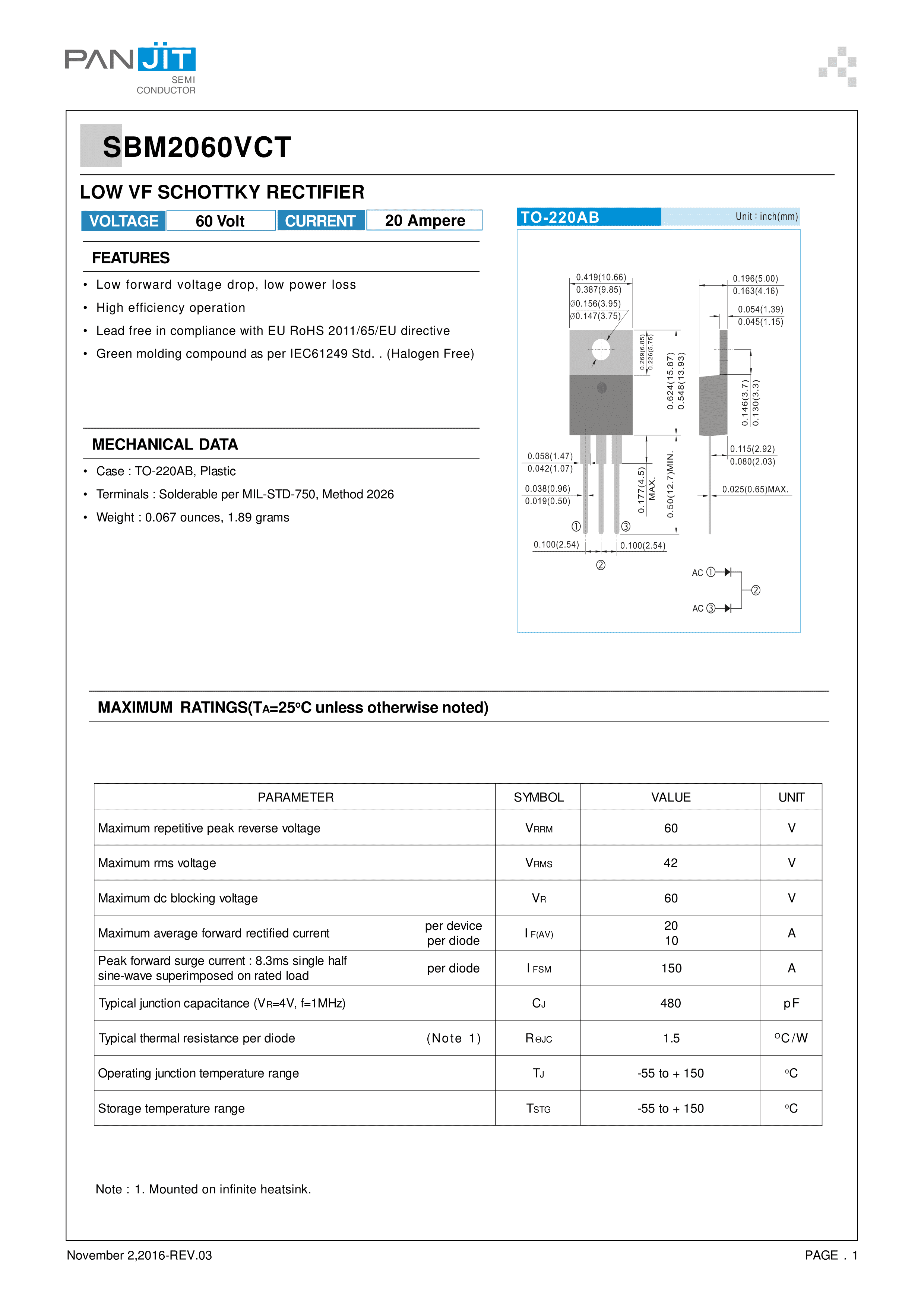 SBM2060VCT_T0_00001数据手册TO-220AB封装PANJIT(强茂)PDF规格书,