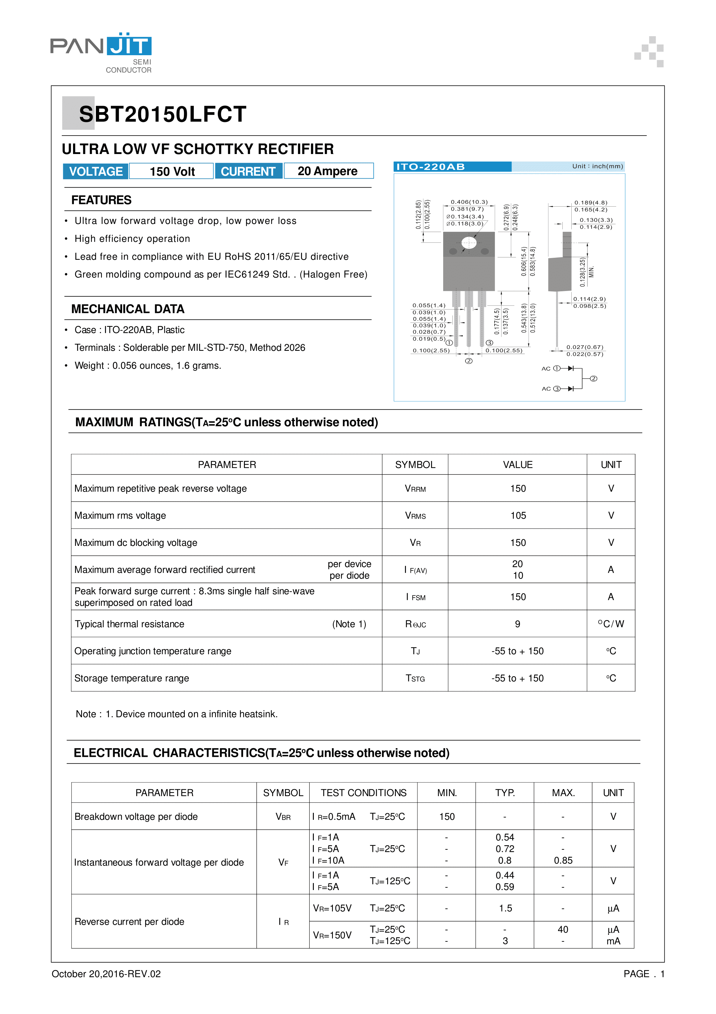 SBT20150LFCT数据手册ITO-220AB封装PANJIT(强茂)PDF规格书,中英文下载