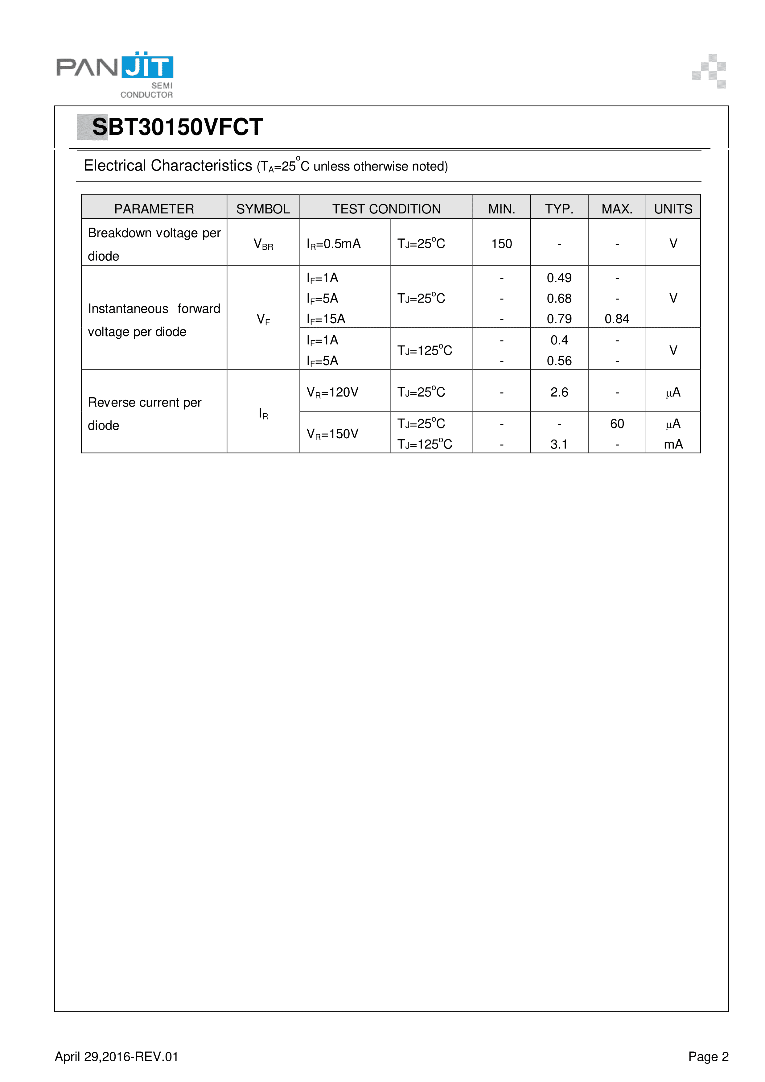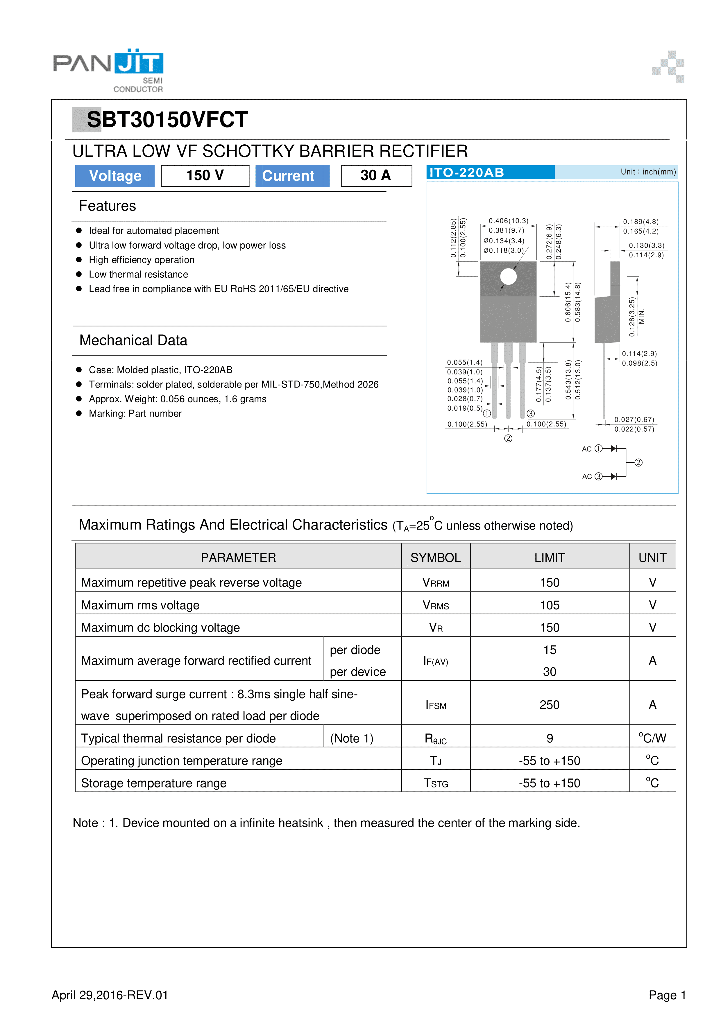 SBT30150VFCT数据手册TO-220F(TO-220IS)封装PANJIT(强茂)PDF规格