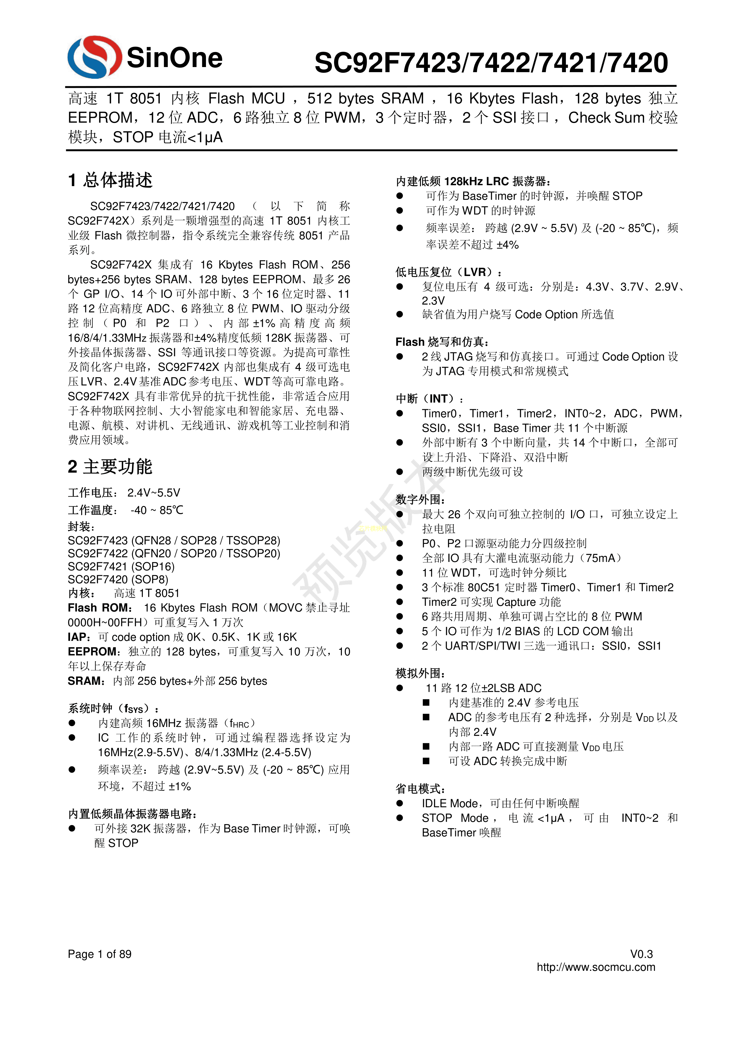 SC92F7422Q20R数据手册QFN-20L封装SOC(赛元)PDF规格书,中英文下载