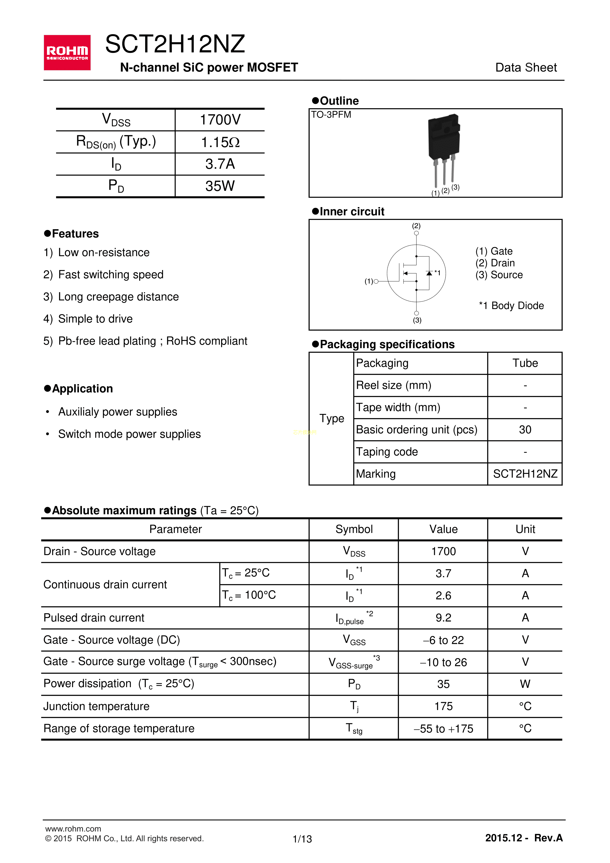 SCT2H12NZGC11数据手册TO-3PFM封装ROHM(罗姆)PDF规格书,中英文下载