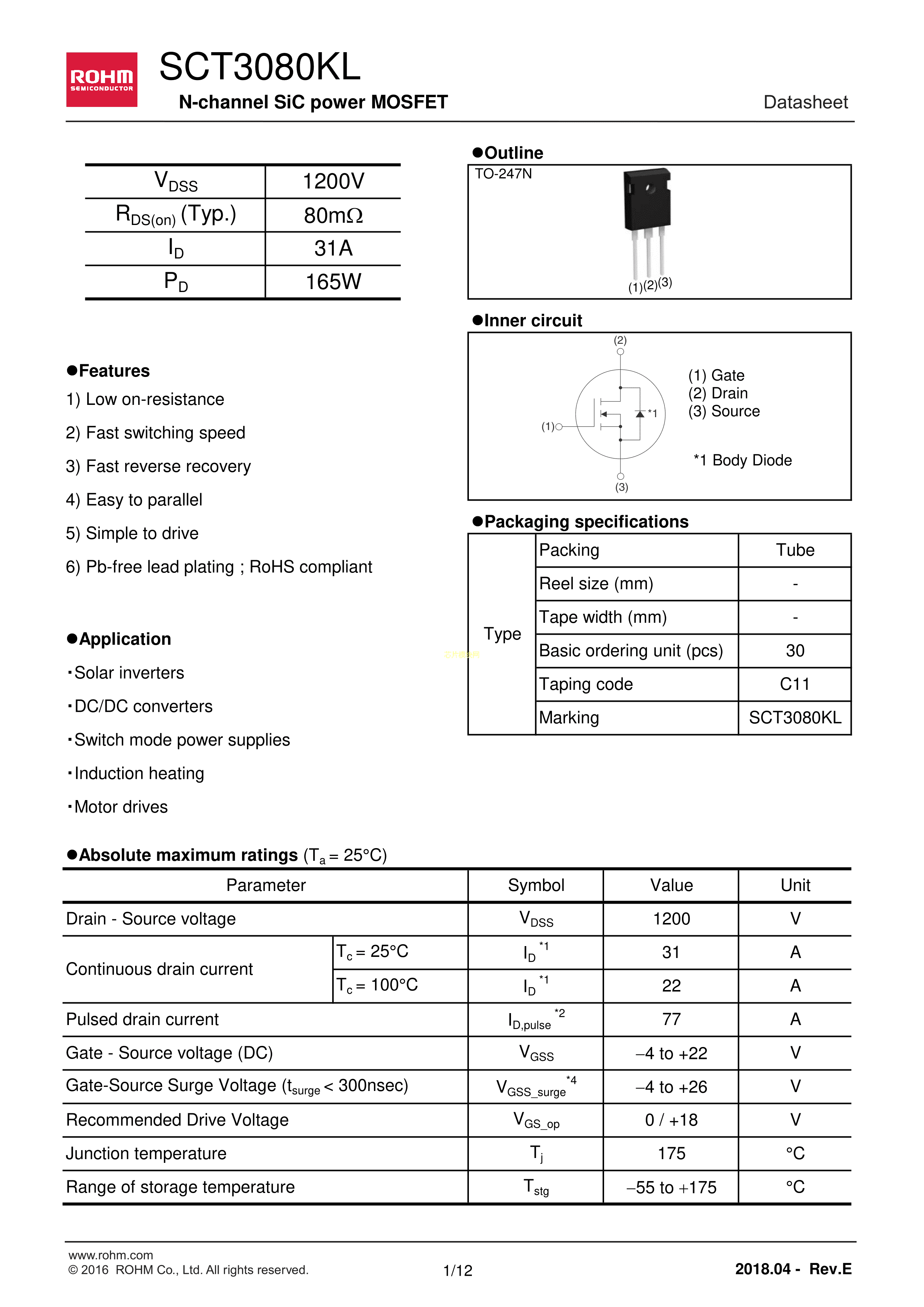 SCT3080KLGC11数据手册TO-247AC封装ROHM(罗姆)PDF规格书,中英文下载