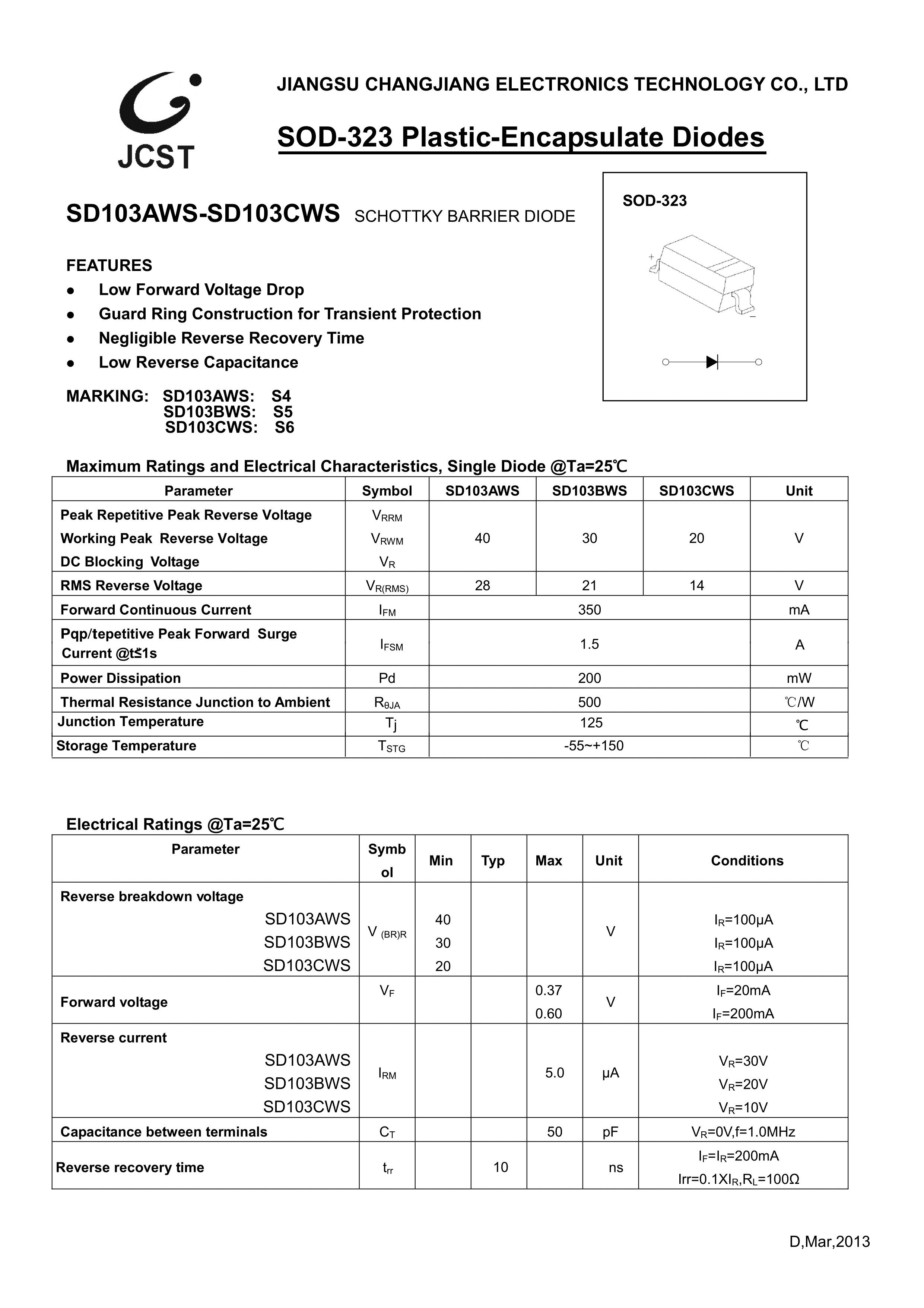 SD103AWS数据手册SOD-323封装CJ(江苏长电-长晶)PDF规格书,中英文下载