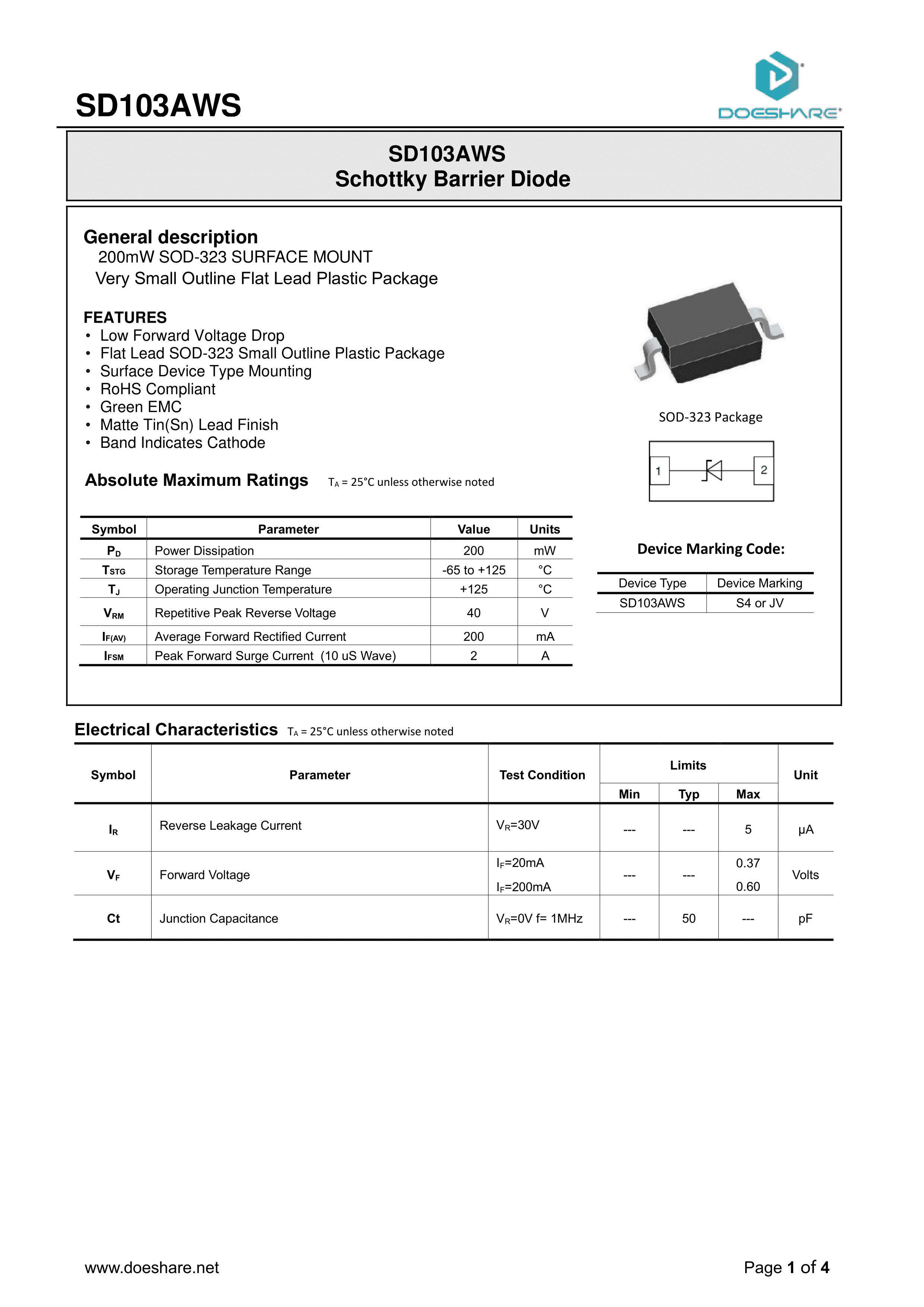 SD103AWS数据手册SOD-323封装Doeshare(德芯)PDF规格书,中英文下载
