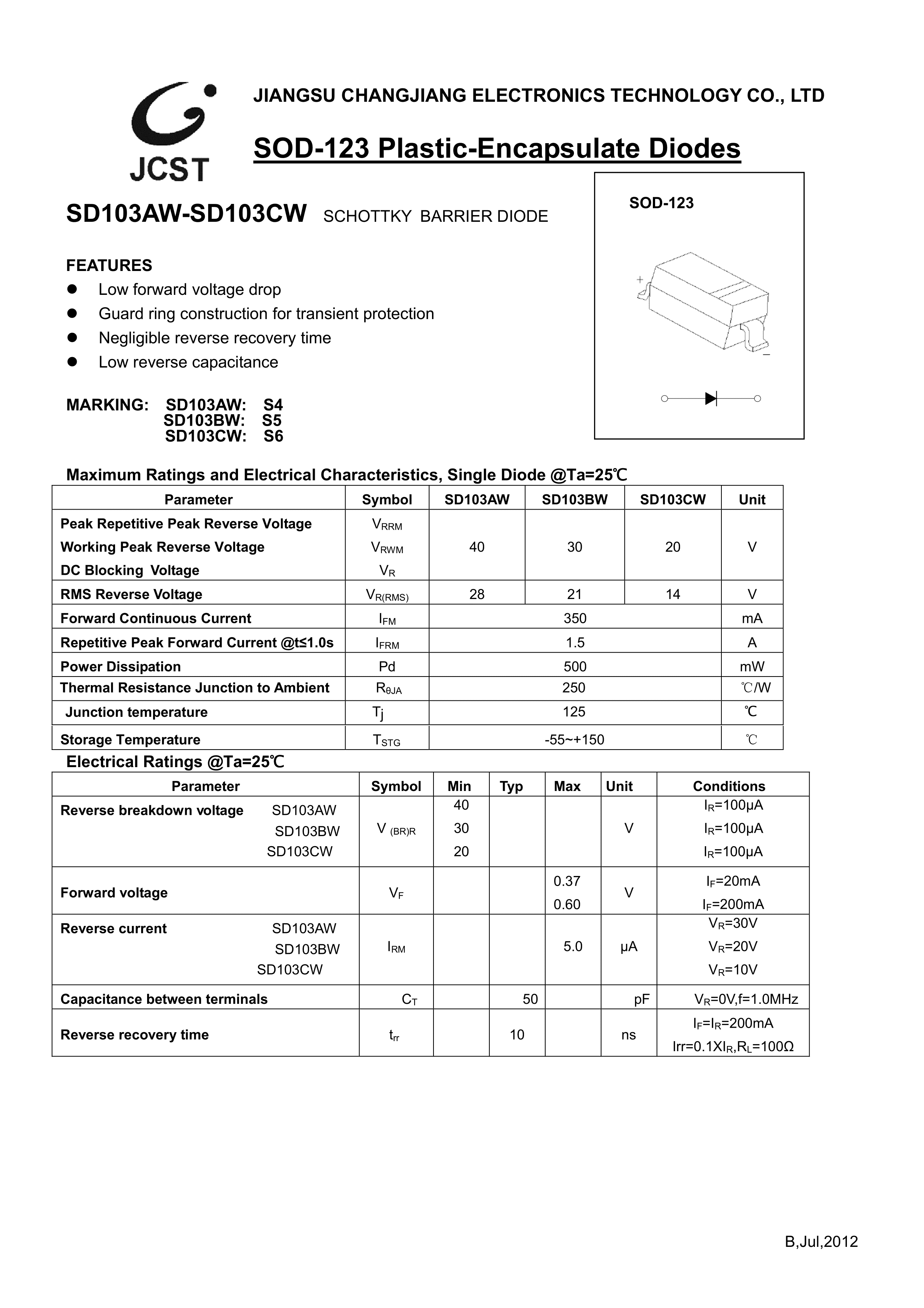 SD103CW 环保数据手册SOD-123封装CJ(江苏长电-长晶)PDF规格书,中英文下载