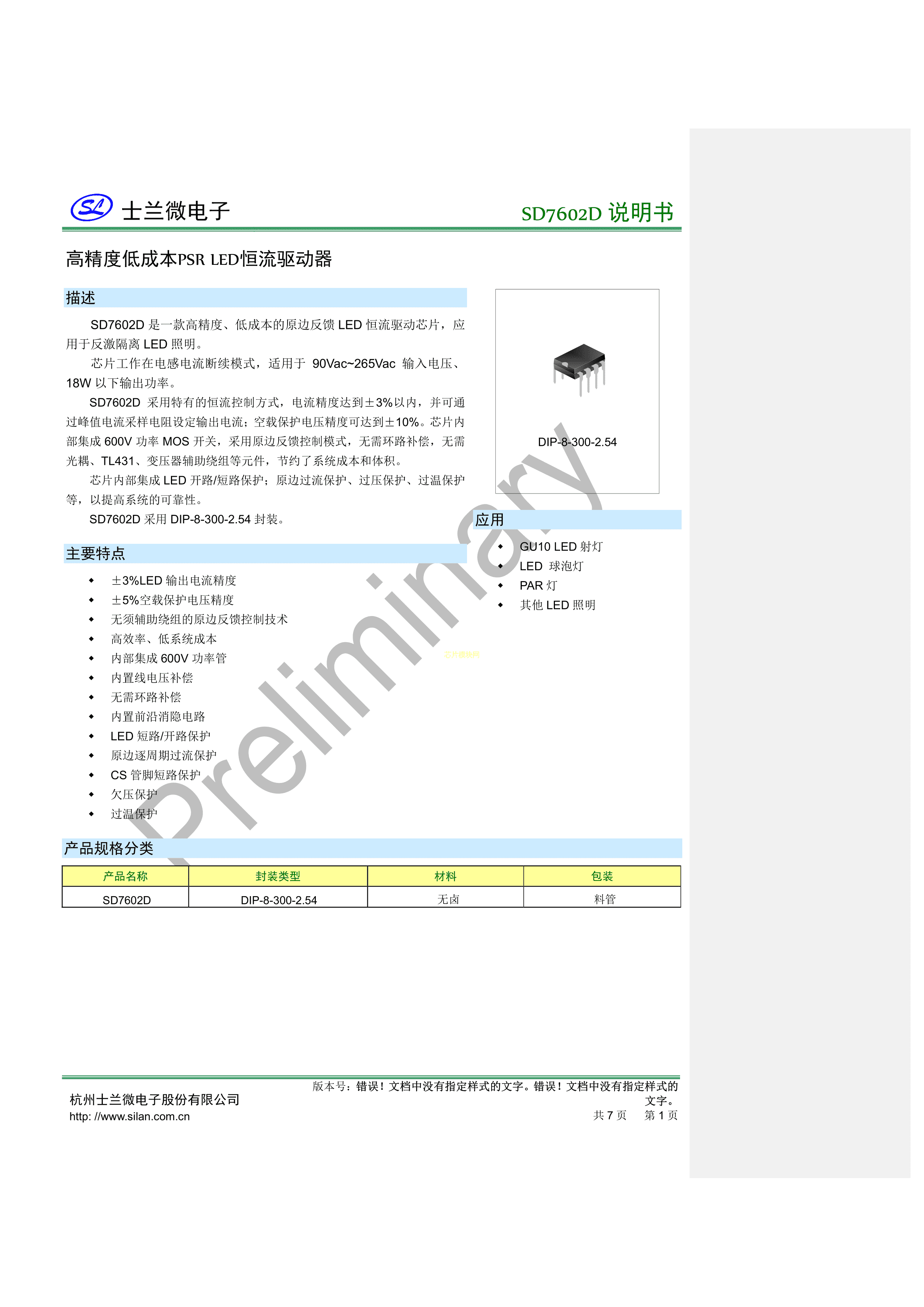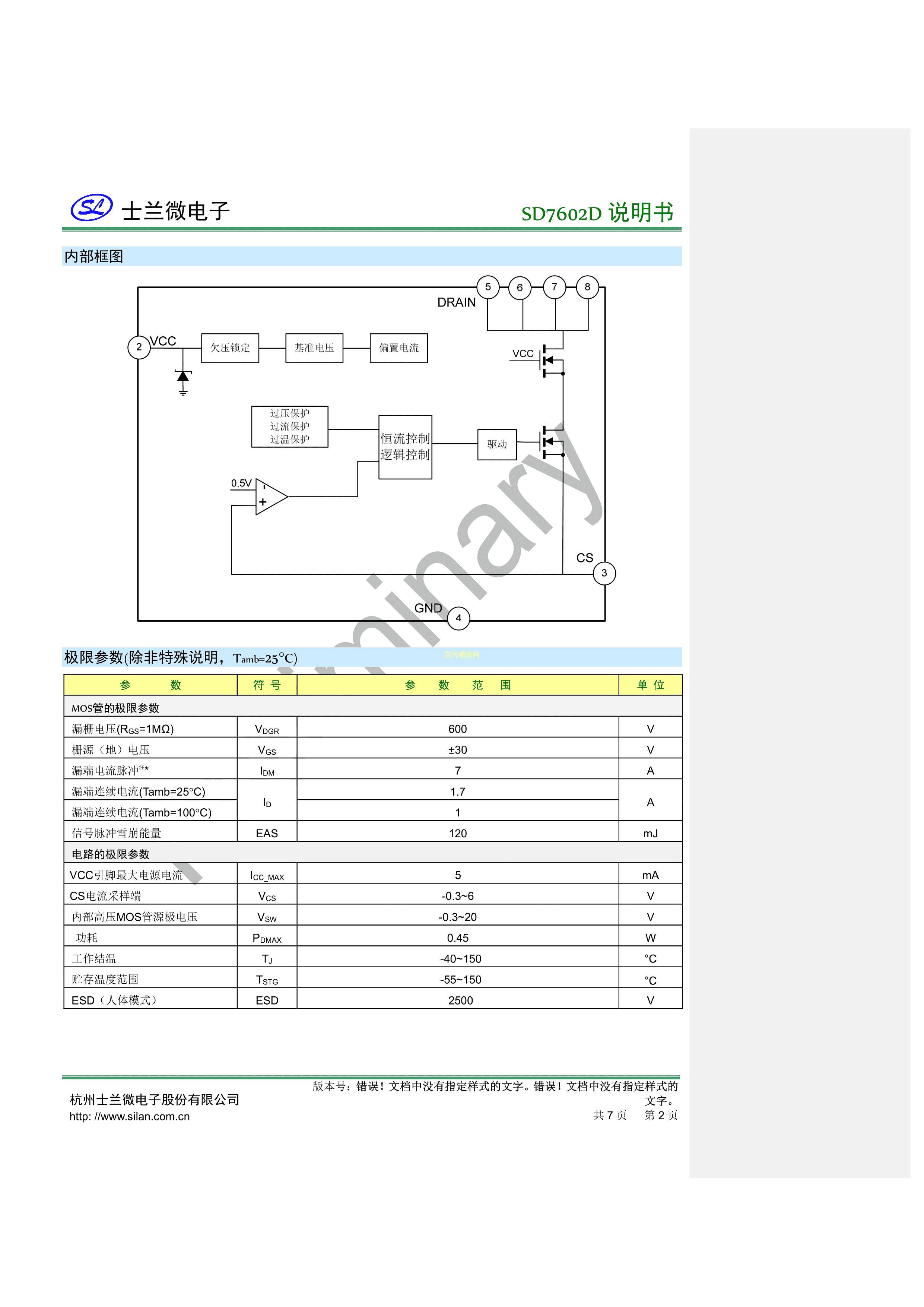 SD7602D数据手册DIP-7封装SILAN(士兰微)PDF规格书,中英文下载