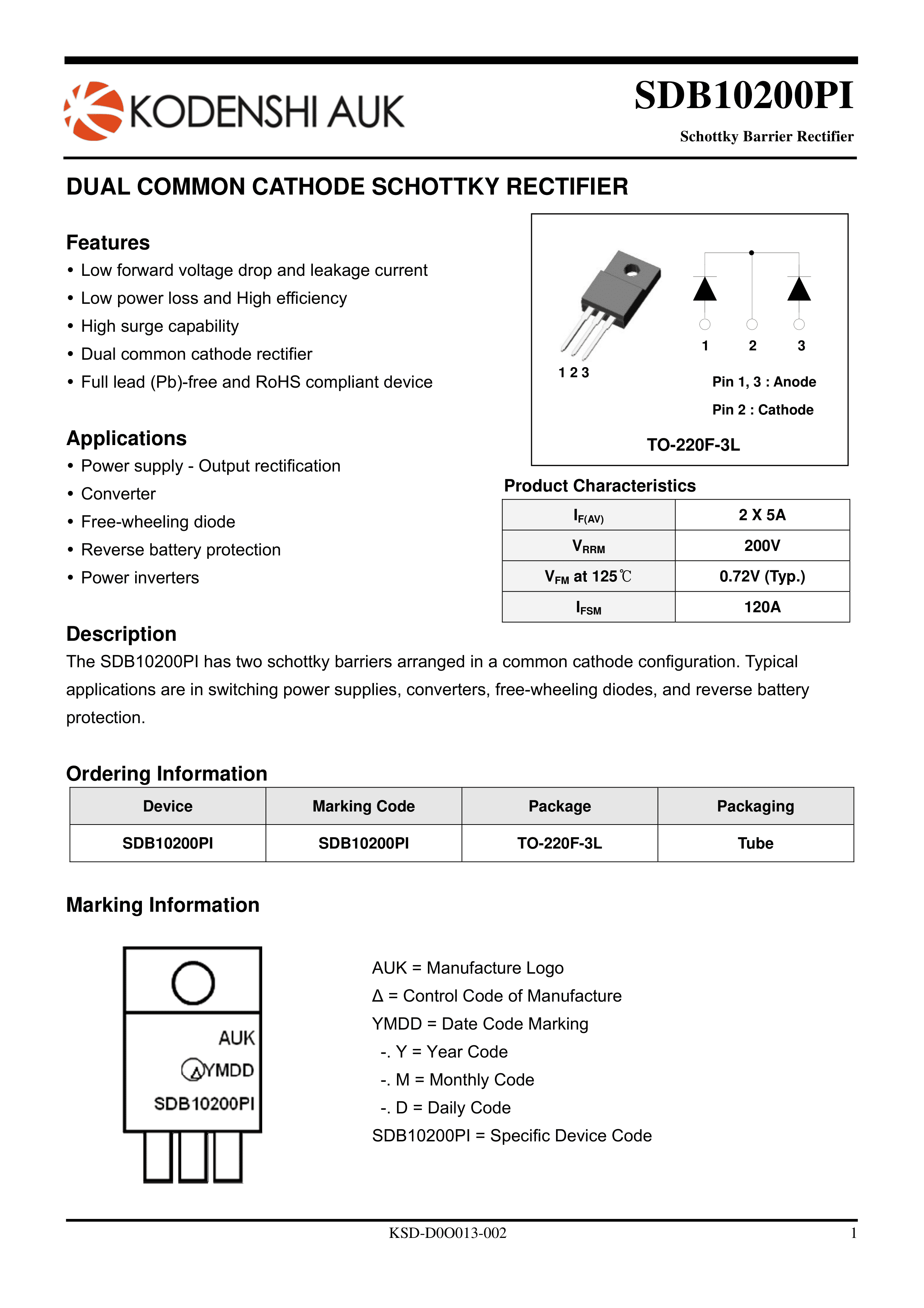 SDB10200PI数据手册TO-220F(TO-220IS)封装KODENSHI AUK(光电子)